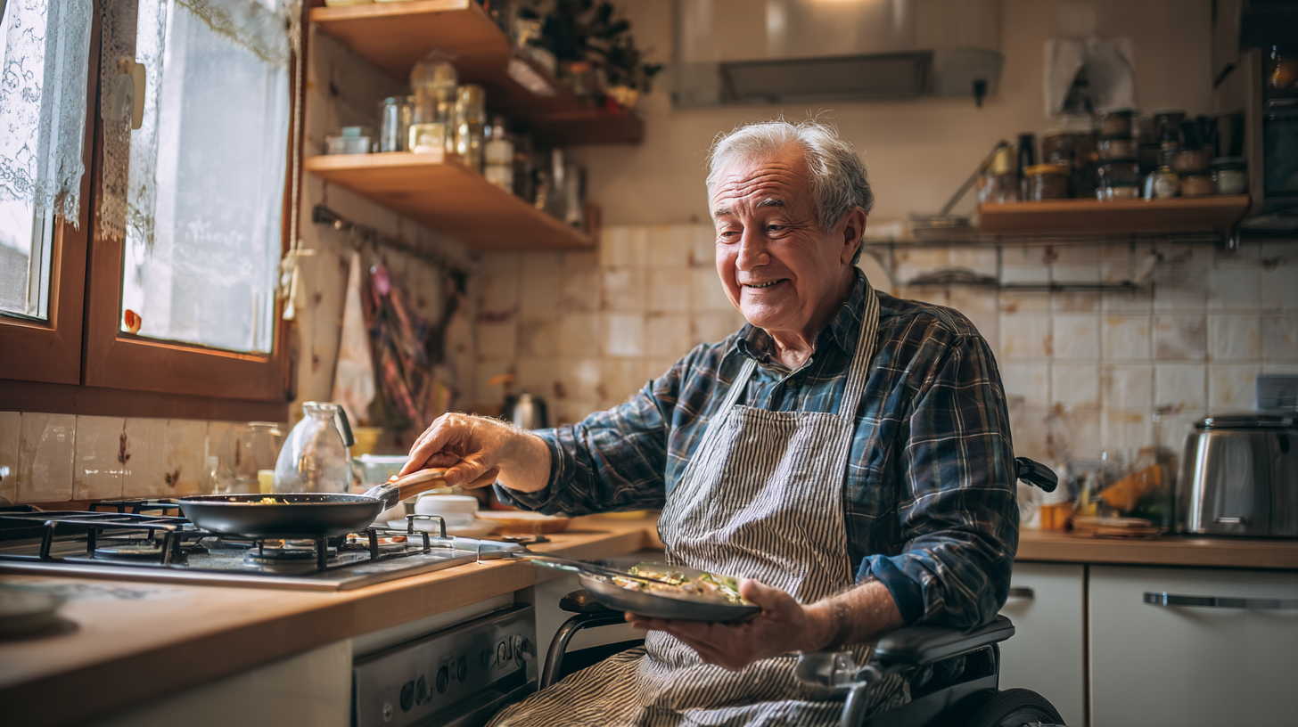 La imagen muestra a un hombre mayor sonriendo mientras cocina en una cocina acogedora. Se encuentra sentado en una silla de ruedas y está vestido con una camisa de cuadros y un delantal claro. En su mano sostiene una espátula y parece estar agregando ingredientes a una sartén que está sobre la estufa. La cocina tiene un ambiente hogareño, con estanterías que exhiben frascos y utensilios de cocina. La luz natural entra a través de las ventanas, iluminando la escena y destacando detalles como los azulejos de la pared y los utensilios colgados. El hombre irradia alegría y satisfacción mientras se dedica a la cocina, sugiriendo un momento de felicidad y creatividad en este espacio familiar.