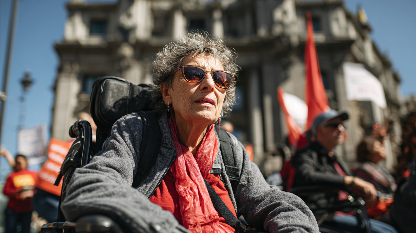 La imagen muestra a una mujer mayor sentada en una silla de ruedas, con un fondo de un evento que parece ser una manifestación. Ella lleva una chaqueta gris y una blusa roja, y usa unas grandes gafas de sol. Su expresión transmite determinación y pensatividad mientras observa lo que ocurre a su alrededor. Detrás de ella, se pueden ver otros participantes en la manifestación, algunos sosteniendo pancartas y banderas, lo que sugiere un ambiente de protesta activa. La luz del sol ilumina la escena, destacando los colores vivos de las vestimentas y los signos, y creando un contraste con la edificación arquitectónica que se encuentra al fondo.
