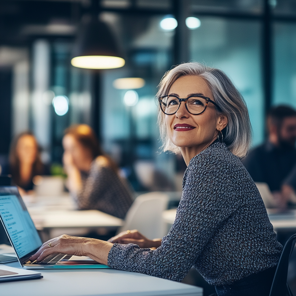 La imagen muestra a una mujer de edad avanzada, con cabello corto y canoso, sentada frente a una computadora portátil en un entorno de oficina moderno. Lleva gafas de marco oscuro y viste una blusa gris con un patrón sutil. La mujer sonríe mientras mira hacia la cámara, proyectando una expresión de confianza y satisfacción. El fondo sugiere un espacio de trabajo colaborativo, con otras personas visibles en segundo plano, involucradas en actividades similares. La iluminación es suave, creando un ambiente acogedor. La escena refleja una atmósfera profesional y contemporánea que sugiere trabajo en equipo y productividad.