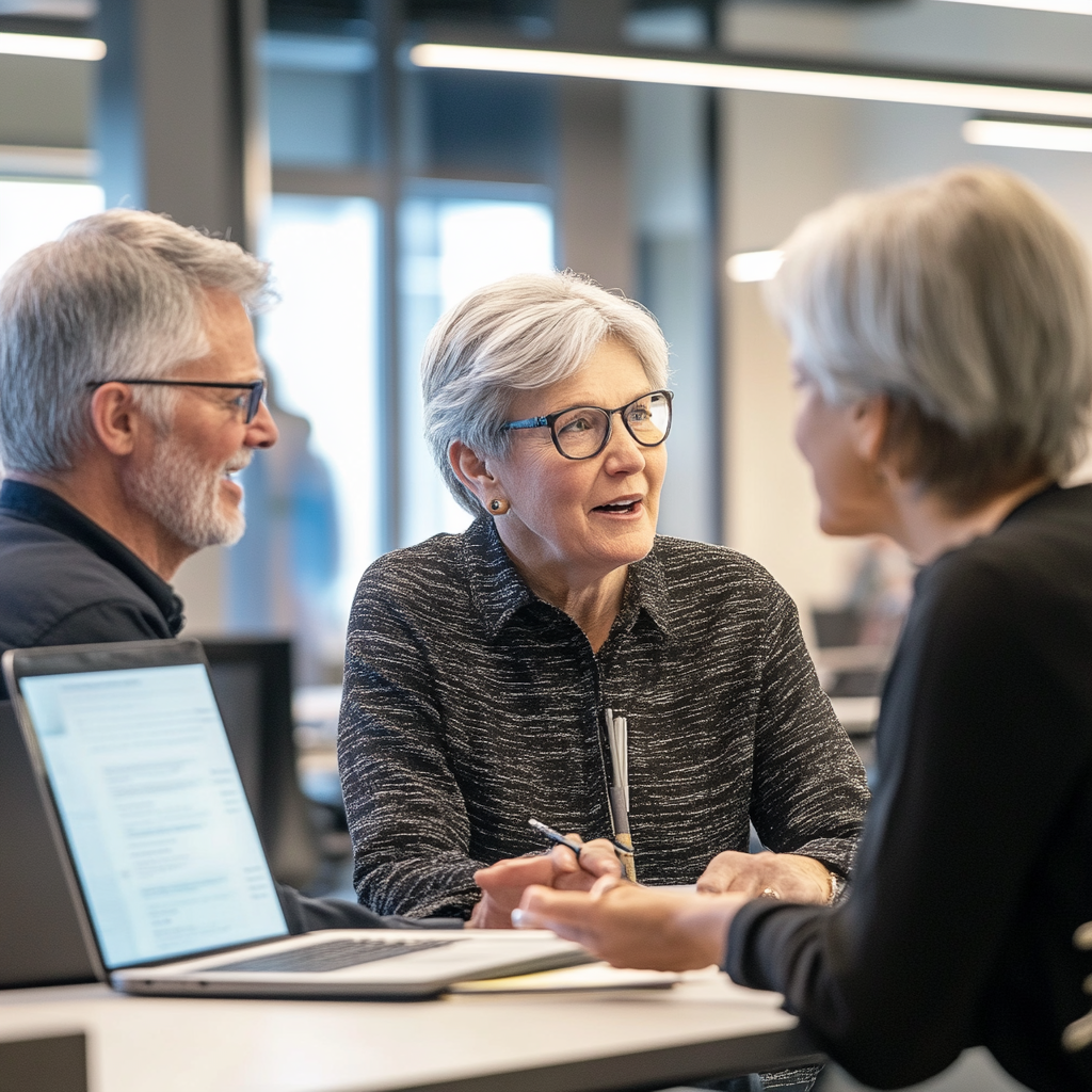 En la imagen se observa a tres personas en un ambiente de oficina moderna, participando activamente en una conversación. Dos de ellos son mujeres, una con cabello corto y canoso, que está hablando y parece entusiasmada, mientras que la otra mujer tiene el cabello un poco más largo y también canoso, escuchando atentamente. Hay un hombre con cabello gris y barba que mira hacia la mujer que habla, mostrando interés en la conversación. En la mesa, hay un portátil abierto que muestra información en la pantalla, junto con algunos papeles y un bolígrafo, lo que indica que están trabajando en un proyecto o discutiendo ideas. El fondo muestra un ambiente luminoso con amplias ventanas que permiten la entrada de luz natural, lo que añade un toque moderno y profesional al espacio.