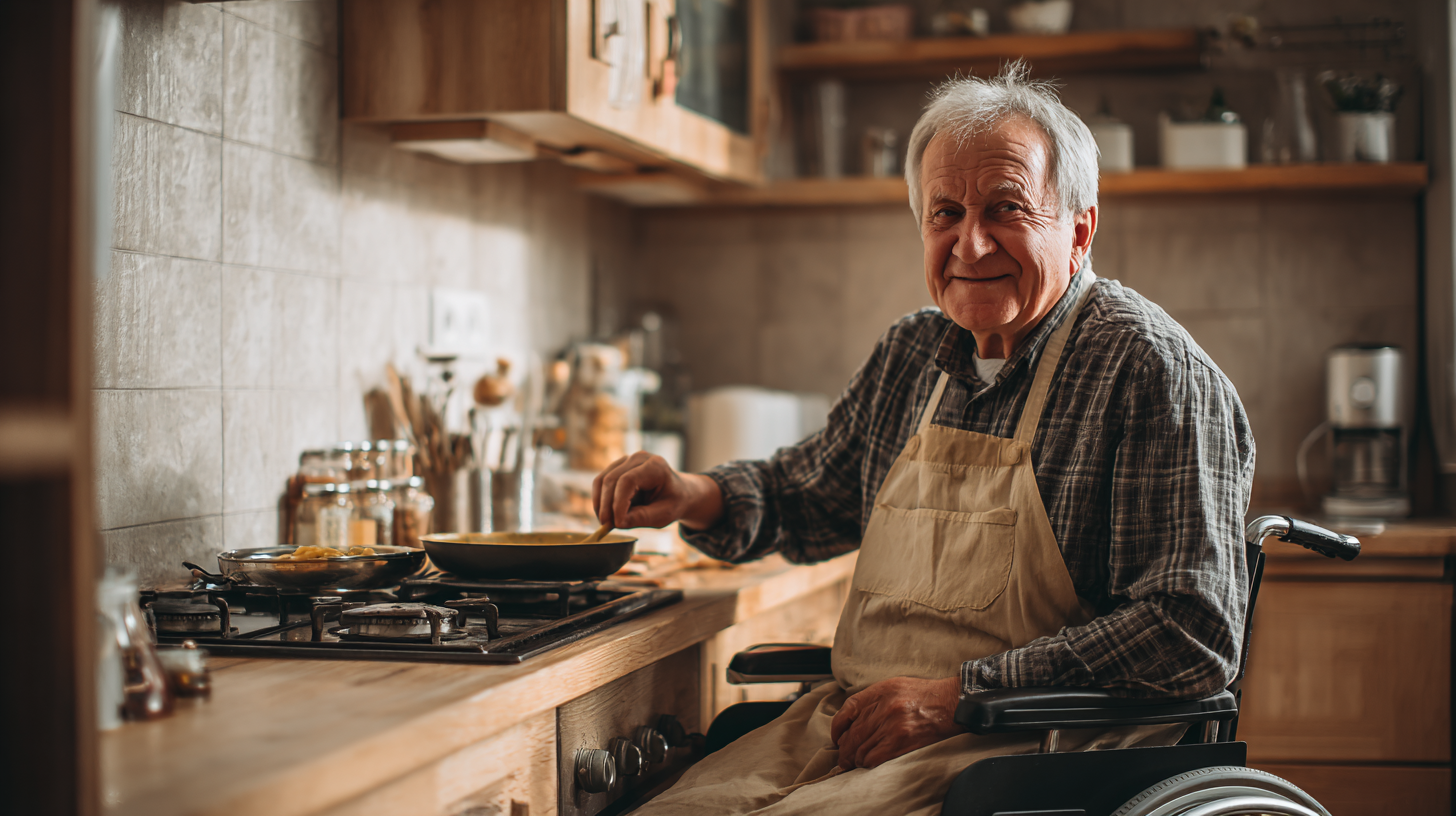 En la imagen se observa a un hombre mayor sentado en una silla de ruedas en una cocina acogedora y bien iluminada. Lleva una camisa de cuadros y un delantal claro, lo que sugiere que está preparado para cocinar. Está sonriendo mientras se inclina ligeramente hacia adelante, manipulando una sartén en la estufa, la cual tiene comida visible. La cocina tiene un diseño moderno, con gabinetes de madera clara, una encimera donde se aprecian frascos de especias y utensilios, y un ambiente cálido que invita a la convivencia. La luz que entra proveniente de una ventana crea una atmósfera hogareña y relajada. El hombre refleja una actitud positiva y parece disfrutar de su actividad culinaria.