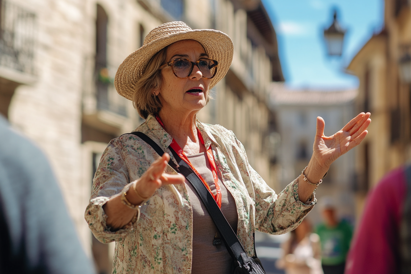 La imagen muestra a una mujer de mediana edad en un entorno urbano, probablemente en una ciudad antigua. Ella lleva un sombrero de paja y lentes oscuros, brindando un aspecto cálido y acogedor. Su rostro refleja entusiasmo mientras gesticula con las manos, más específicamente levantando las palmas hacia adelante, lo que sugiere que está dando una explicación o narrando una historia a su audiencia. Detrás de ella, se pueden observar edificios de piedra con balcones tradicionales, lo que añade un aire histórico al lugar. En el fondo, hay personas, probablemente turistas, que parecen escucharla atentamente, lo que indica que la mujer es una guía turística. La iluminación es brillante y el cielo es mayormente claro, lo que contribuye a la atmósfera alegre de la escena.