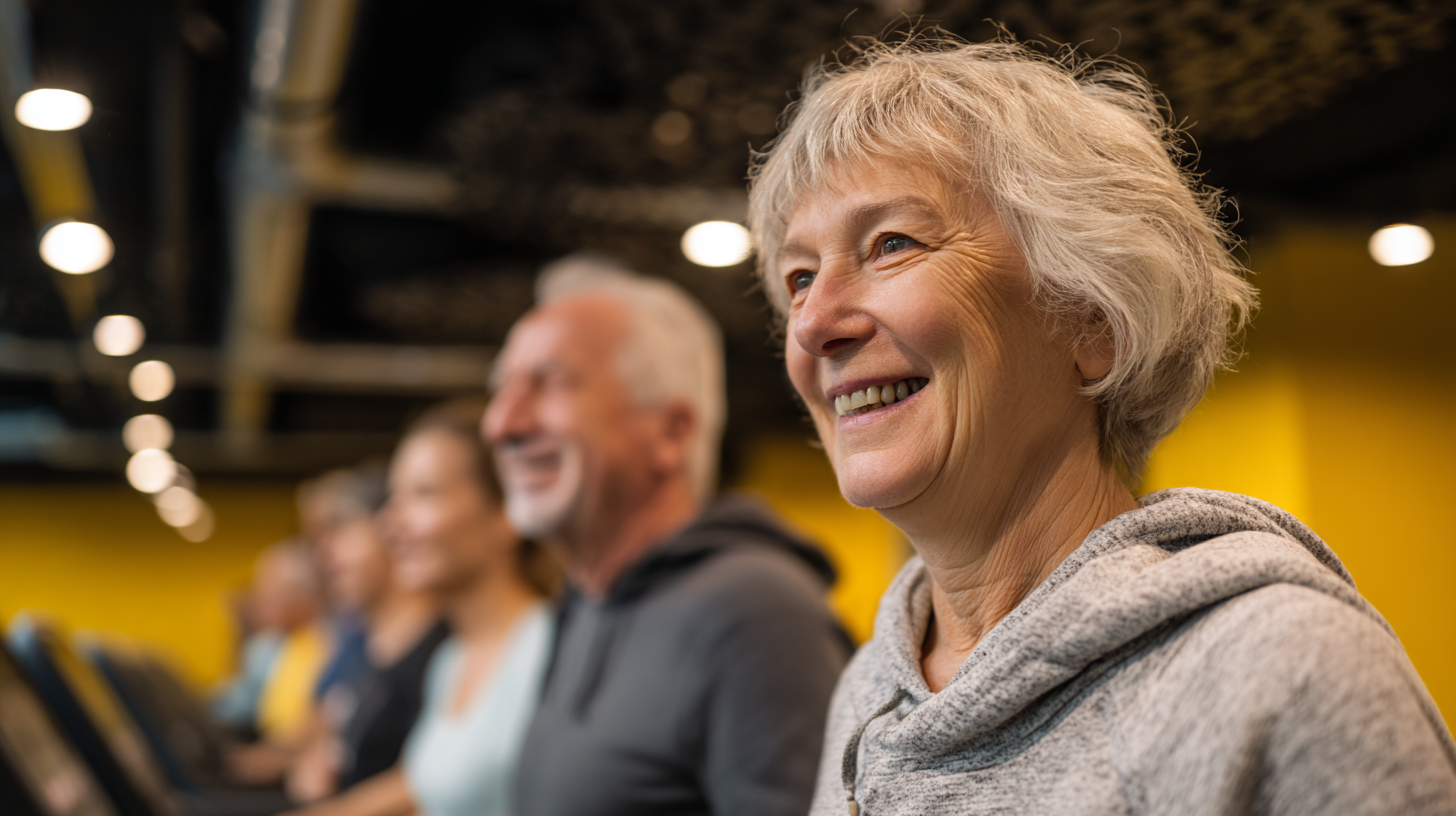 La imagen muestra a un grupo de personas en un gimnasio, con un enfoque en una mujer mayor que sonríe. Ella tiene el cabello corto y canoso, y está vestida con una chaqueta gris. La expresión de su rostro irradia alegría y satisfacción. Al fondo, se pueden ver otros individuos, de distintas edades, participando en actividades de ejercicio, aunque no están claramente enfocados. La decoración del gimnasio incluye paredes de color amarillo y un techo con tubos expuestos y luces que proporcionan un ambiente acogedor y moderno. La escena transmite una sensación de comunidad y bienestar, destacando la importancia de mantenerse activo y social en la edad avanzada.
