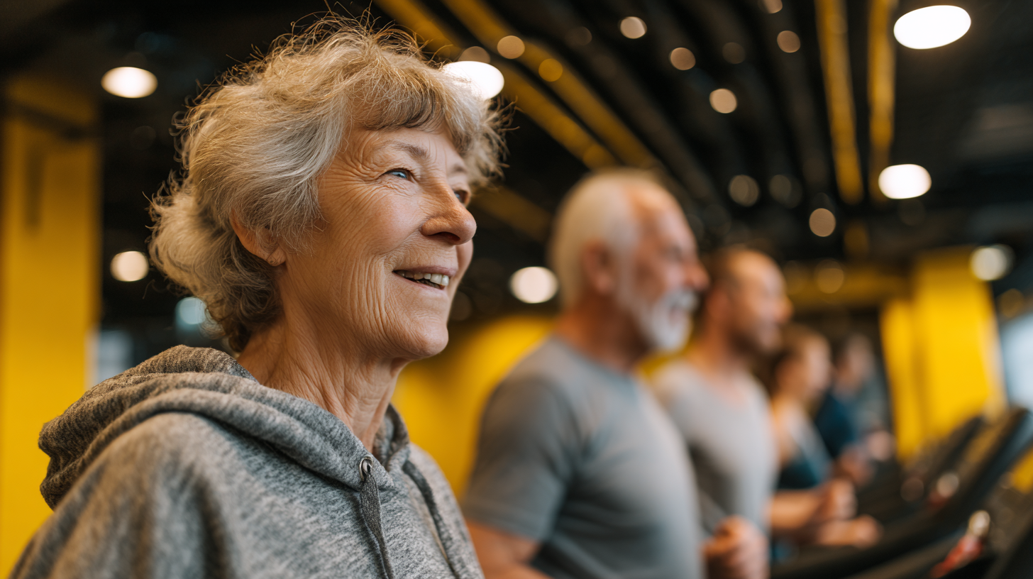 La imagen presenta un grupo de personas mayores en un gimnasio, que parecen estar realizando ejercicio en máquinas de correr. En primer plano, se destaca una mujer de cabello corto y canoso, que lleva puesta una sudadera gris. Su expresión facial muestra felicidad y satisfacción, sugiriendo que está disfrutando del momento. Detrás de ella, se pueden ver otros hombres y mujeres mayores, todos concentrados en su actividad física. El gimnasio tiene un ambiente moderno, con paredes de color amarillo brillante y un diseño contemporáneo. La iluminación es suave, resaltando la energía positiva del lugar. La escena transmite un mensaje de vitalidad, ejercicio y comunidad entre personas de la tercera edad, desafiando estereotipos sobre la actividad física en esa etapa de la vida.