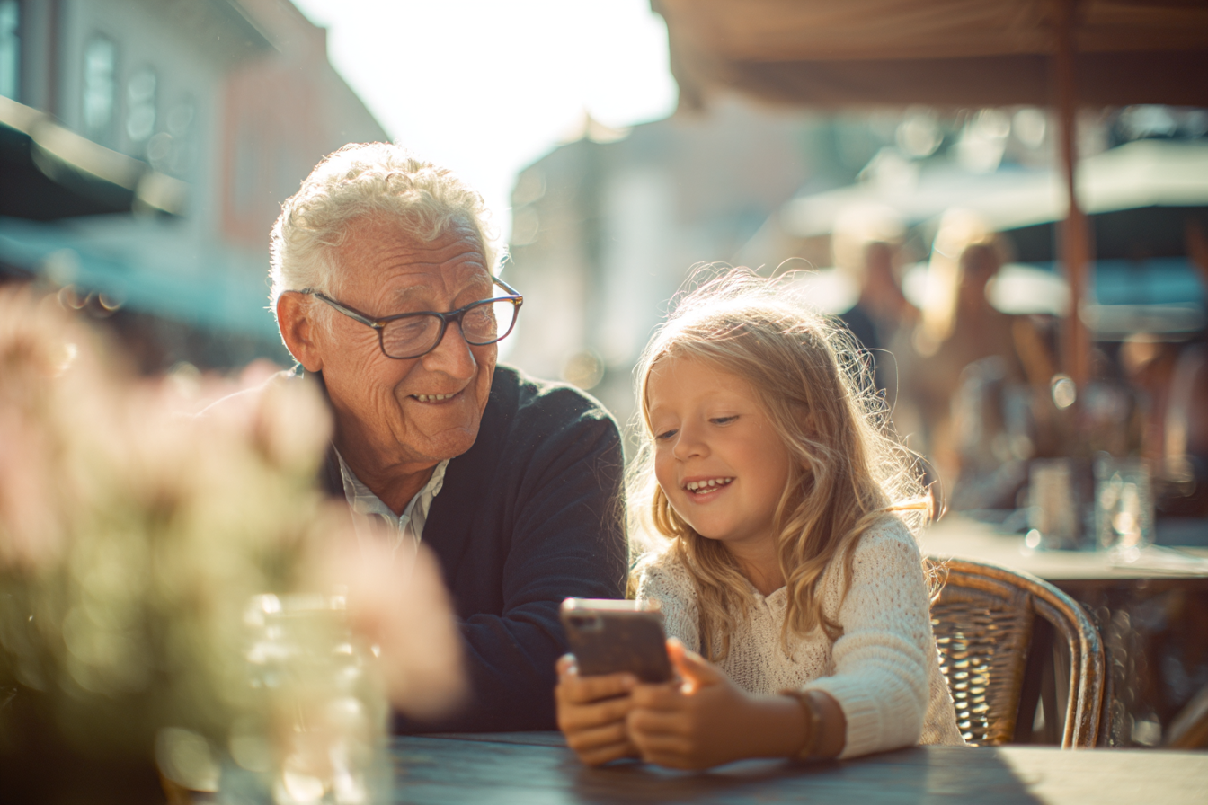 La imagen muestra a un abuelo y su nieta sentados en una mesa al aire libre de un café o restaurante. La luz del sol ilumina suavemente la escena, creando un ambiente cálido y acogedor. El abuelo, con cabello rizado y canoso, lleva unas gafas y sonríe mientras mira a su nieta. La niña, de cabello largo y rubio, sostiene un smartphone en sus manos, mostrando una expresión de alegría y entusiasmo. Ambos parecen disfrutar de un momento especial juntos, compartiendo una experiencia digital que la niña proporciona. Al fondo, se pueden ver otras mesas y personas, pero están desenfocadas, lo que resalta la conexión entre abuelo y nieta. Un arreglo de flores blanqueadas se encuentra en el primer plano, añadiendo un toque natural a la escena.