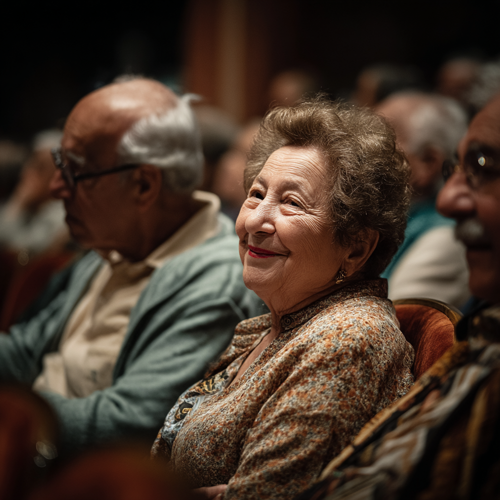 La imagen muestra a un grupo de personas mayores sentadas en un auditorio, probablemente disfrutando de un evento o espectáculo. En el primer plano, una mujer de cabello rizado y canoso muestra una expresión de alegría y satisfacción, con una ligera sonrisa en su rostro, como si estuviera apreciando el momento. Lleva una blusa de colores cálidos y un collar que complementa su atuendo. A su lado, hay otro hombre de avanzada edad que también parece inmerso en la experiencia, aunque su expresión es más seria. El fondo está compuesto de otros asistentes que, aunque desenfocados, sugieren un ambiente acogedor. La iluminación es suave, lo que crea una atmósfera íntima y amigable, resaltando la conexión emocional de las personas en la imagen.