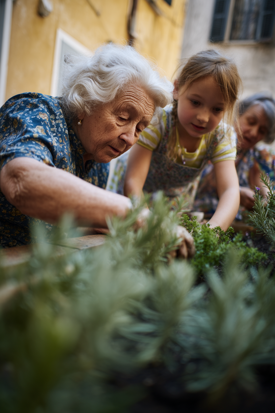 La imagen muestra a una anciana con cabello canoso trabajando en un jardín junto a una niña pequeña. Ambas están concentradas en la tarea de cuidar las plantas, que parecen ser hierbas frescas y saludables. La mujer mayor lleva una blusa con un diseño floral, y su expresión refleja dedicación y ternura mientras cuida el jardín. La niña, con su cabello atado y vestida con una camiseta de rayas bajo un delantal, parece interesada y lista para ayudar. Al fondo, se pueden ver más personas trabajando en el jardín, lo que sugiere un ambiente comunitario o familiar. El espacio está iluminado de manera suave, y las paredes de color amarillo añaden un toque cálido y acogedor a la escena, resaltando la conexión entre generaciones a través de la jardinería.