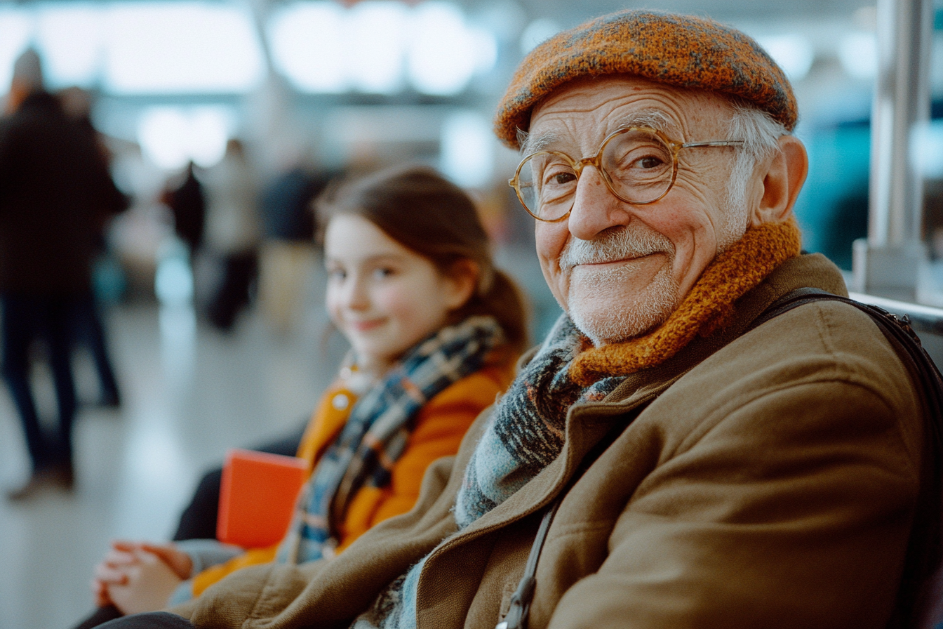 La imagen muestra a un anciano y una niña sentados juntos en un entorno que parece ser una estación o un terminal concurrido. El anciano, con un sombrero de lana y gafas, tiene una expresión amigable y sonriente, y lleva un abrigo marrón y una bufanda que dan un aire acogedor. A su lado, la niña, con una chaqueta de color naranja y una bufanda a rayas, también sonríe, mirando hacia el frente. El fondo presenta un ambiente desenfocado, con otras personas que se mueven, lo que sugiere un lugar de alta actividad. La iluminación es suave y cálida, resaltando la conexión entre los dos personajes y creando un ambiente nostálgico y alegre.