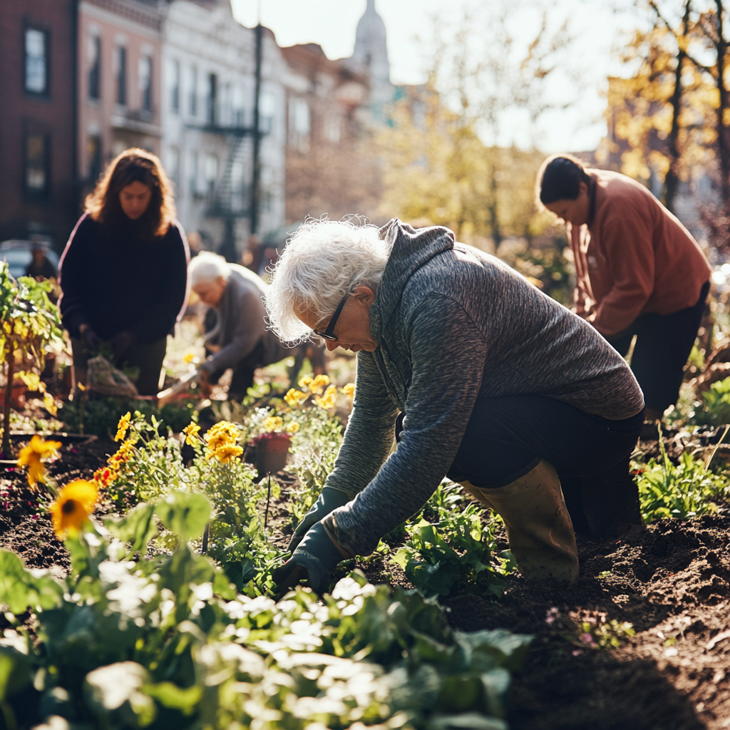 En la imagen, un grupo de personas se dedica a la jardinería en un espacio comunitario al aire libre. Destaca una mujer de cabello canoso y rizado, vestida con un suéter gris y gafas, que se agacha para plantar o cuidar las flores y plantas en el suelo. A su alrededor, se pueden ver otros jardineros, algunos de ellos también en cuclillas y trabajando entre las verdes hortalizas y coloridas flores. La luz del sol, que ilumina la escena, sugiere que es un día claro y agradable. Al fondo, se aprecian edificios de estilo urbano que enmarcan este espacio verde, destacando un ambiente comunitario y cálido, donde la gente se une en actividades de cultivo y cuidado del entorno. Los colores vibrantes de las flores añaden vida y energía a la imagen.