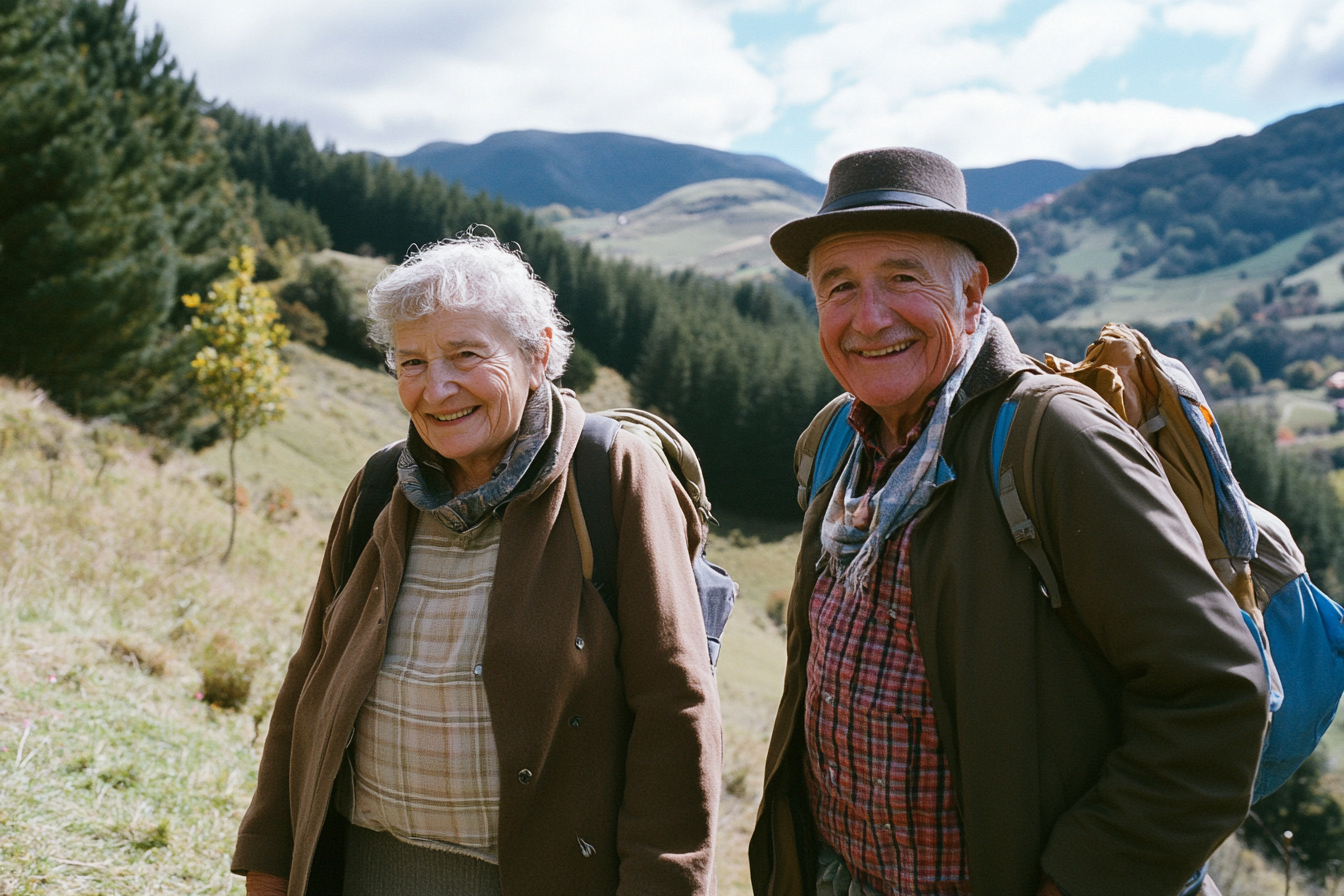 La imagen presenta a una pareja de personas mayores sonriendo en un entorno natural. Ambos llevan ropa informal y cómoda, ideal para el senderismo. La mujer tiene el cabello canoso y lleva una chaqueta marrón con un suéter claro debajo, mientras que el hombre usa un sombrero de ala ancha y una chaqueta gris con una camisa a cuadros. Se encuentran en un paisaje montañoso, rodeados de árboles en un día soleado, con un cielo parcialmente nublado. El fondo muestra colinas verdes y un arbusto pequeño cerca de ellos, lo que sugiere que están disfrutando de una caminata al aire libre. La expresión en sus rostros refleja alegría y satisfacción, indicando un momento de felicidad compartida en la naturaleza.