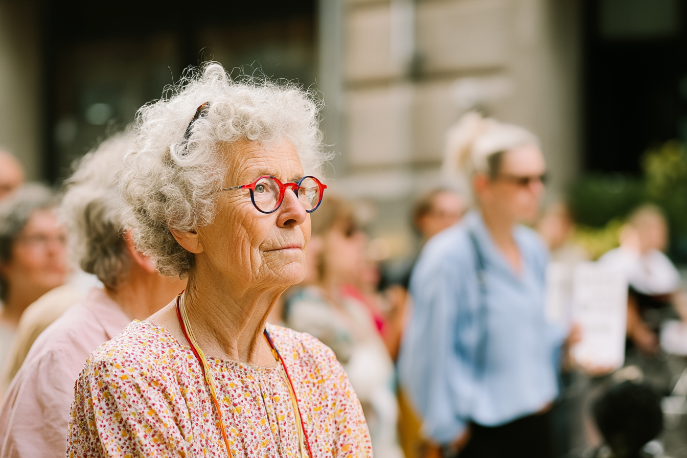 La imagen muestra a una mujer mayor con cabello rizado y canoso, que lleva puestas gafas redondas de color rojo. Ella está vestida con una blusa de colores suaves y un diseño floral. Su expresión es reflexiva y seria, mientras observa atentamente lo que sucede a su alrededor en un ambiente que parece ser un evento o reunión pública. Detrás de ella se pueden ver otros asistentes, aunque la mujer es el foco principal de la imagen. Se percibe un ambiente de atención colectiva, con personas en diferentes etapas de la vida. El fondo es ligeramente desenfocado, lo que permite que su expresión sea más impactante, destacando la conexión emocional con el público presente.