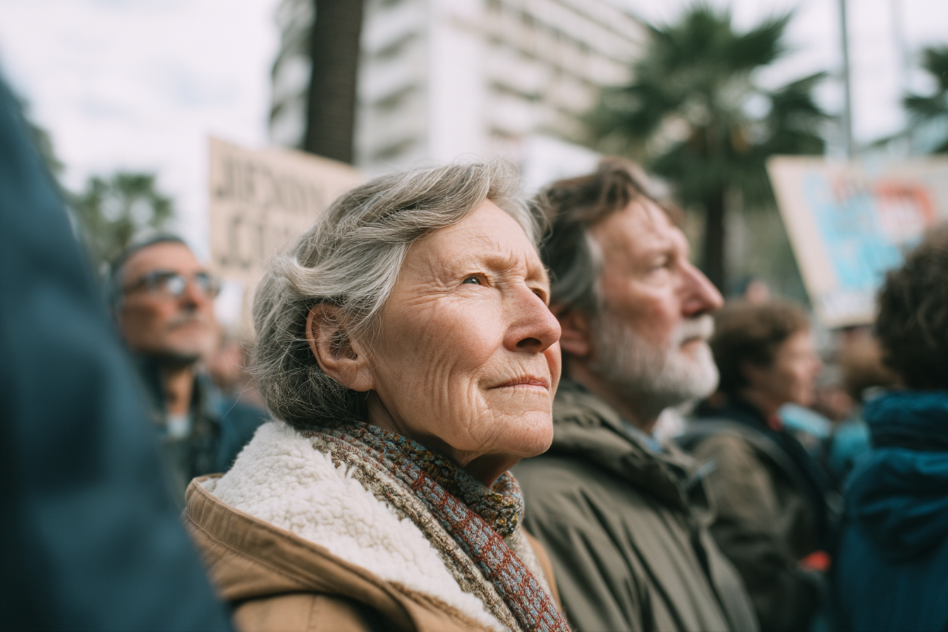 La imagen muestra a un grupo de personas en un evento de protesta o manifestación. En primer plano, una mujer mayor con cabello canoso y una expresión reflexiva destaca entre la multitud. Lleva una chaqueta clara y un abrigo con un cuello que parece estar abrigado con una bufanda colorida. Su mirada es pensativa y transmite un sentido de compromiso con la causa. Detrás de ella, se pueden ver otras personas, incluida un hombre con barba y cabello canoso, también en actitud seria. Al fondo, se asoman varias palmeras, sugiriendo que el evento tiene lugar en un entorno urbano, posiblemente en una ciudad costera. Se aprecian carteles, aunque el texto específico de los mismos no es legible, lo que indica el propósito de la manifestación y la unión de los asistentes. La escena capta un momento de seriedad y determinación, reflejando la importancia de la causa defendida.