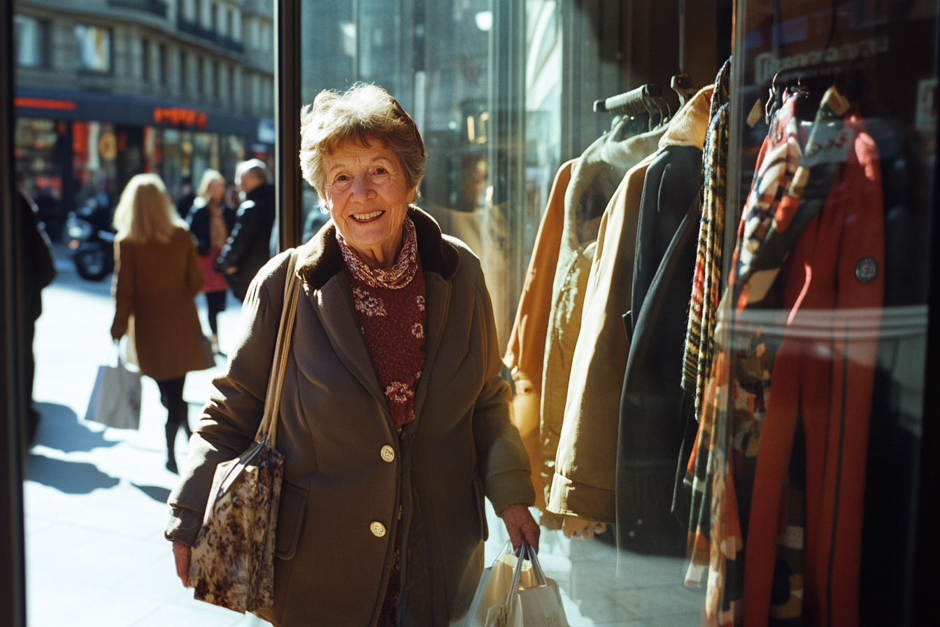 La imagen muestra a una mujer mayor sonriendo frente a un escaparate de una tienda. Ella lleva un abrigo de color marrón claro y una bufanda que sugiere un estilo acogedor. En su mano, sostiene dos bolsas de compras, mientras que en el fondo se pueden ver otras personas paseando por la acera, algunas con bolsas en la mano. La luz del sol ilumina la escena, creando un ambiente cálido y alegre. El escaparate refleja una variedad de prendas de vestir colgadas, incluyendo abrigos coloridos que aportan un toque vibrante a la imagen. La calle parece ser una zona comercial concurrida, con edificios que sugieren un ambiente urbano.