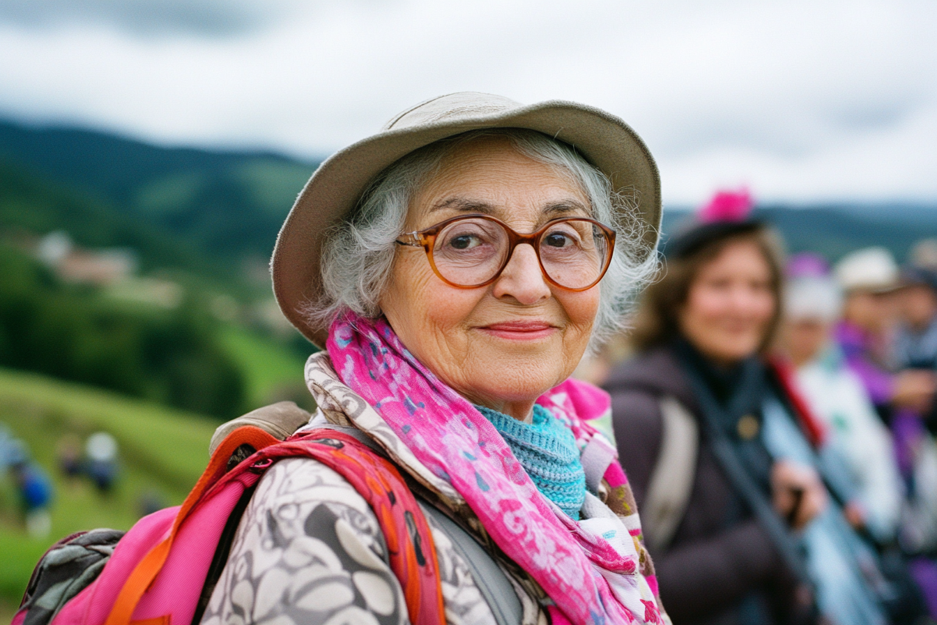 La imagen muestra a una mujer mayor sonriendo y mirando hacia la cámara. Tiene el cabello canoso, que enmarca su rostro y está recogido bajo un sombrero claro. Lleva puestas unas grandes gafas de montura oscura y un conjunto de ropa cómodo, adornado con un chal colorido que incluye tonos de rosa y azul. Detrás de ella se pueden ver otras personas, ligeramente desenfocadas, lo que sugiere que se encuentra en un evento o actividad al aire libre, posiblemente una caminata o excursión. El fondo resalta un paisaje natural con colinas verdes bajo un cielo nublado, lo que añade un ambiente sereno y acogedor a la escena.