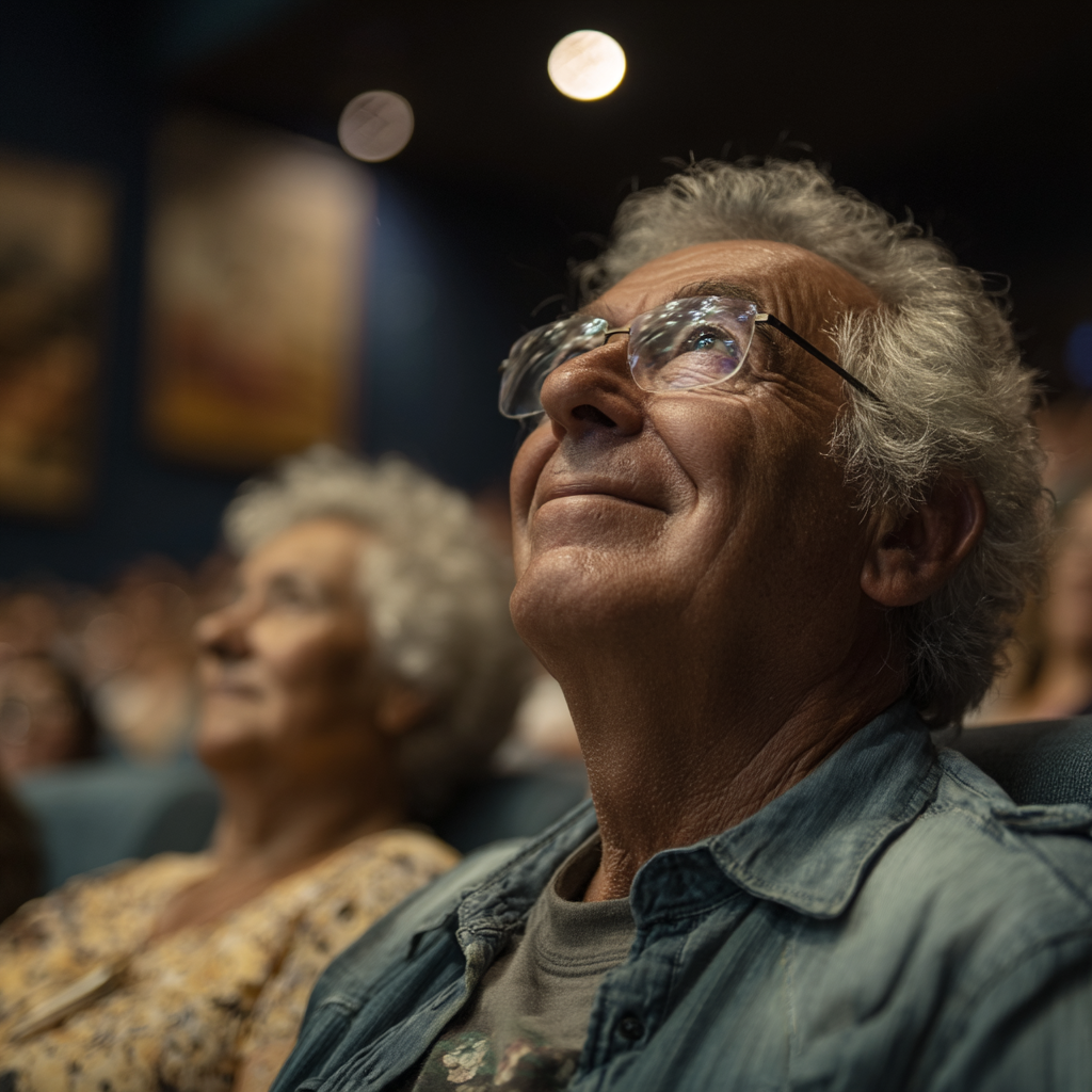 La imagen muestra a un hombre mayor sentado en un teatro, con una expresión de asombro y felicidad mientras observa algo en el escenario. Su cabello es canoso y rizado, y lleva gafas que reflejan la luz. Está vestido con una camisa de mezclilla sobre una camiseta. Detrás de él, se puede ver a una mujer mayor con cabello rizado y canoso, que parece también estar disfrutando del espectáculo. La ambientación es acogedora, con una iluminación tenue y un fondo que muestra a otros espectadores desenfocados. Las paredes parecen decoradas con arte, lo que sugiere que el lugar tiene un carácter cultural. La composición transmite una sensación de disfrute y conexión emocional al estar en un espectáculo en vivo.