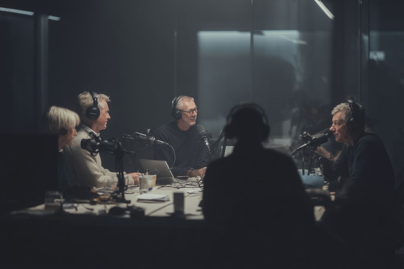 La imagen muestra a un grupo de cuatro personas sentadas alrededor de una mesa en un estudio de grabación, participando en una conversación o grabación de un podcast. Cada persona lleva auriculares y está en comunicación activa, mostrando interés en el intercambio de ideas. La mesa está equipada con varios micrófonos, laptops y tazas, lo que sugiere un ambiente de trabajo colaborativo. La iluminación es tenue, creando una atmósfera íntima y profesional, con un fondo oscuro que realza la atención en los participantes. La disposición de las sillas y micrófonos indica que están en medio de una discusión enfocada. Se percibe una variedad de edades entre los participantes, y su lenguaje corporal sugiere una conversación dinámica y amena.