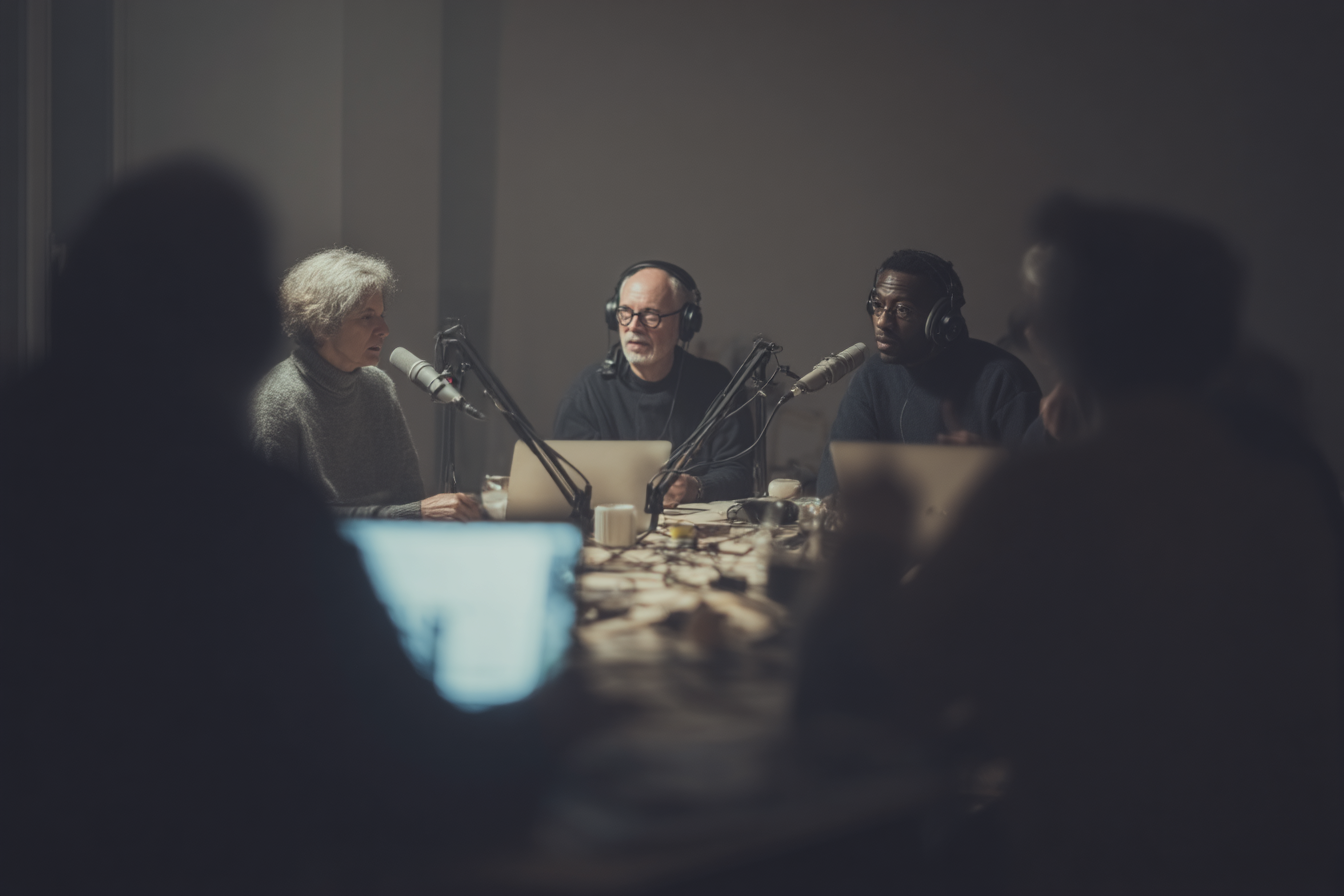 La imagen muestra un grupo de seis personas sentadas alrededor de una mesa, participando en una grabación de podcast. Hay un ambiente íntimo y concentrado, con luces suaves que iluminan el área. Al fondo, una mujer de cabello rizado y grisoso habla frente a un micrófono, mientras un hombre de mediana edad con gafas y barba observa atentamente. A su lado, un hombre joven usa auriculares y parece estar tomando notas o reflexionando sobre lo que se dice. En la mesa hay varios dispositivos, incluyendo computadoras portátiles y tazas de café. Las sillas ocupadas parecen cómodas, y el tono general de la imagen sugiere una discusión profunda y significativa. En el primer plano, solo se ven las siluetas de otros oyentes que escuchan atentamente.