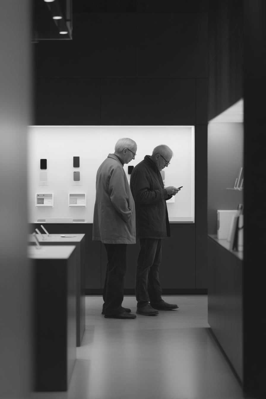 La imagen en blanco y negro muestra a dos hombres mayores de pie en un entorno minimalista, probablemente dentro de una tienda de tecnología. Los hombres están de lado, con uno de ellos sosteniendo un teléfono móvil y mirando hacia la pantalla. La iluminación es suave, proveniente de una pared de fondo iluminada que resalta los objetos expuestos, posiblemente teléfonos móviles, dispuestos en estantes delgados. Los hombres visten abrigos oscuros y parecen concentrados en su actividad, representando una escena cotidiana. El diseño del espacio es moderno, con superficies limpias y líneas rectas que contribuyen a un ambiente elegante y contemporáneo. La composición también sugiere un contraste entre las generaciones, evidenciado por el uso de tecnología.