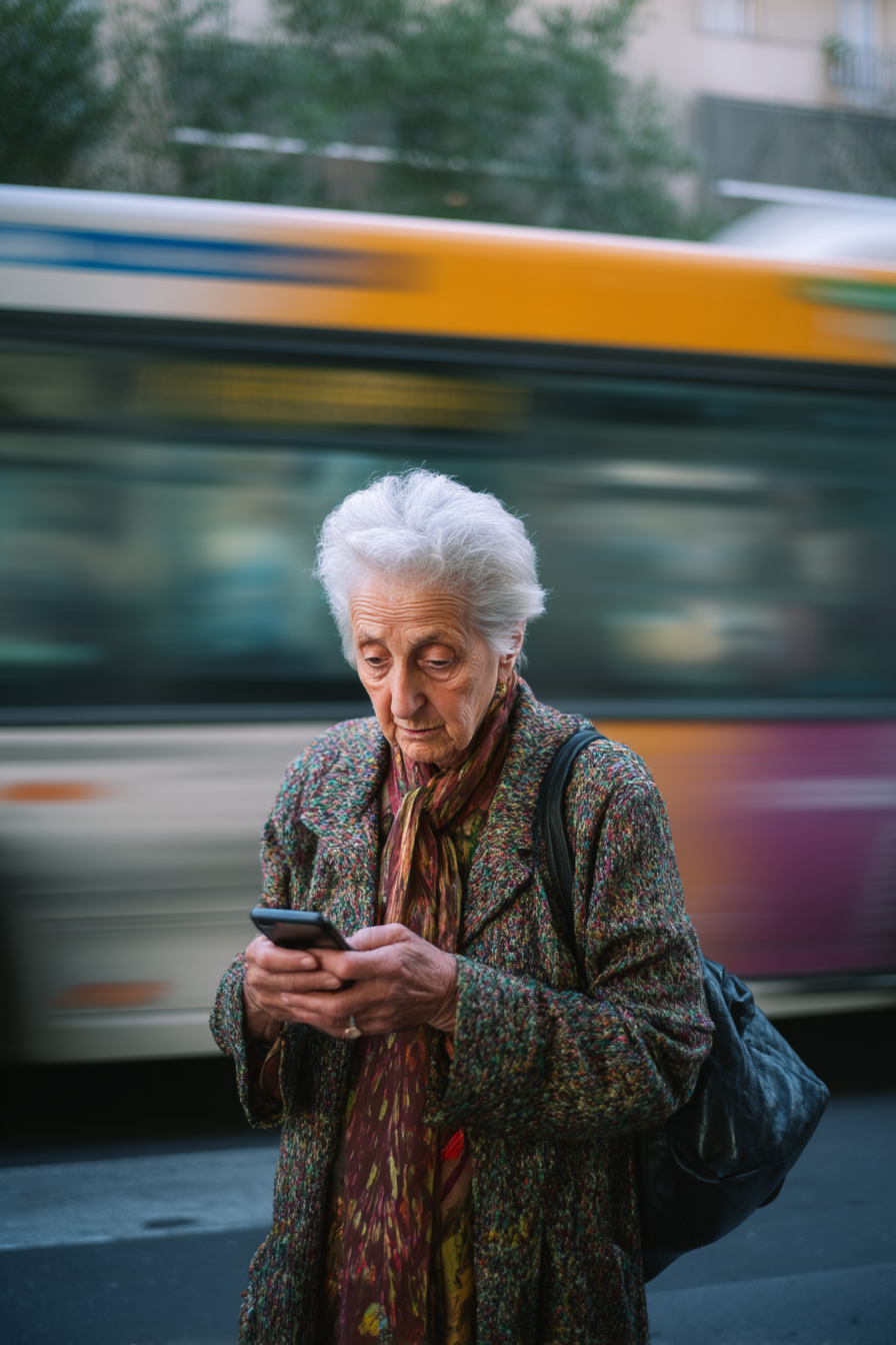 La imagen presenta a una mujer mayor de cabello canoso, vestida con un abrigo de colores variados y una bufanda que complementa su atuendo. Ella está concentrada en su teléfono móvil, con una expresión de seriedad en su rostro. En el fondo, se puede observar un autobús que pasa rápidamente, lo que crea un efecto de movimiento borroso, contrastando con la quietud de la mujer. La escena tiene lugar en un entorno urbano, visible a través de los árboles y edificios que enmarcan la imagen. La luz del día ilumina la escena, realzando los detalles del abrigo y la bufanda de la mujer.