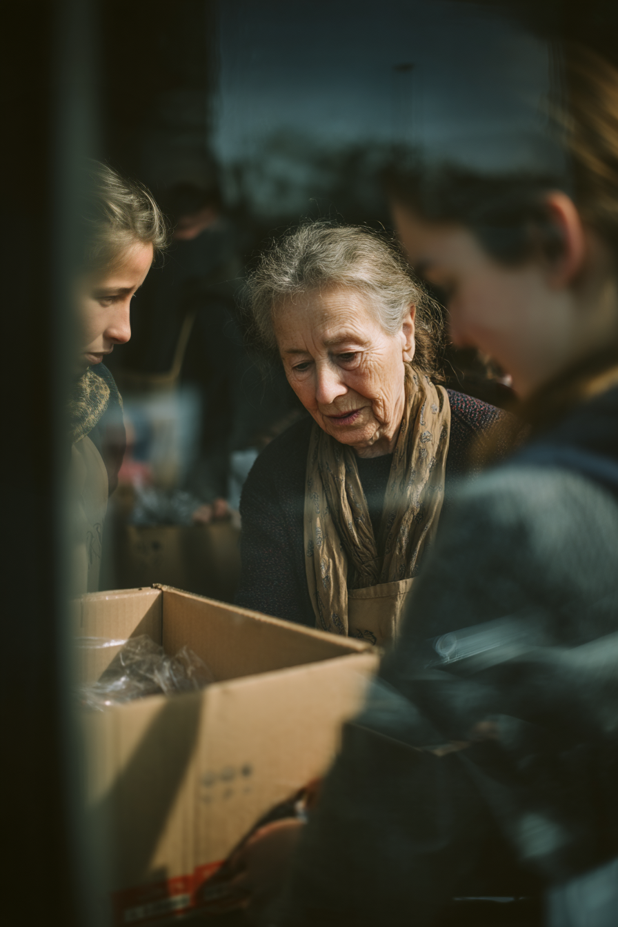 La imagen muestra a tres personas trabajando juntas en un entorno que parece ser un evento de voluntariado o una actividad comunitaria. En el primer plano, una mujer mayor, con cabello gris y una expresión concentrada, está revisando el contenido de una caja de cartón. Lleva una bufanda que complementa su atuendo, sugiriendo que está vestida de manera cómoda. A su lado, una joven con cabello claro y rizado observa atentamente. La iluminación suave y cálida resalta el ambiente colaborativo y bondadoso de la escena. En el fondo, se pueden distinguir otras personas organizando cajas, lo que sugiere un esfuerzo colectivo. La imagen, a través de su composición y tono, evoca sentimientos de comunidad y altruismo.