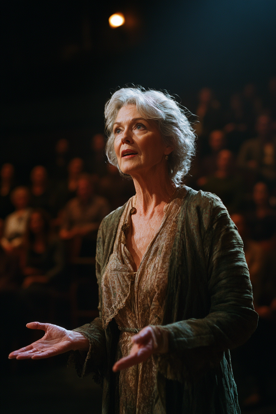 La imagen muestra a una mujer de edad avanzada, con cabello gris y rizado, que se encuentra en el centro de un escenario iluminado. Ella viste una ropa suelta y arrugada, de tonos terrosos, que parece evocar un estilo vintage o clásico. Su expresión es intensa y concentrada, mientras levanta las manos en un gesto que sugiere una actuación emocional. Detrás de ella, se puede observar a un grupo de personas encaramadas en las sombras, que parecen estar disfrutando de su actuación. La luz del escenario ilumina su rostro, acentuando las arrugas y la expresión de su mirada, lo que añade un toque dramático a la escena. La atmósfera general evoca una sensación de arte teatral, con un enfoque en la conexión entre el artista y el público.