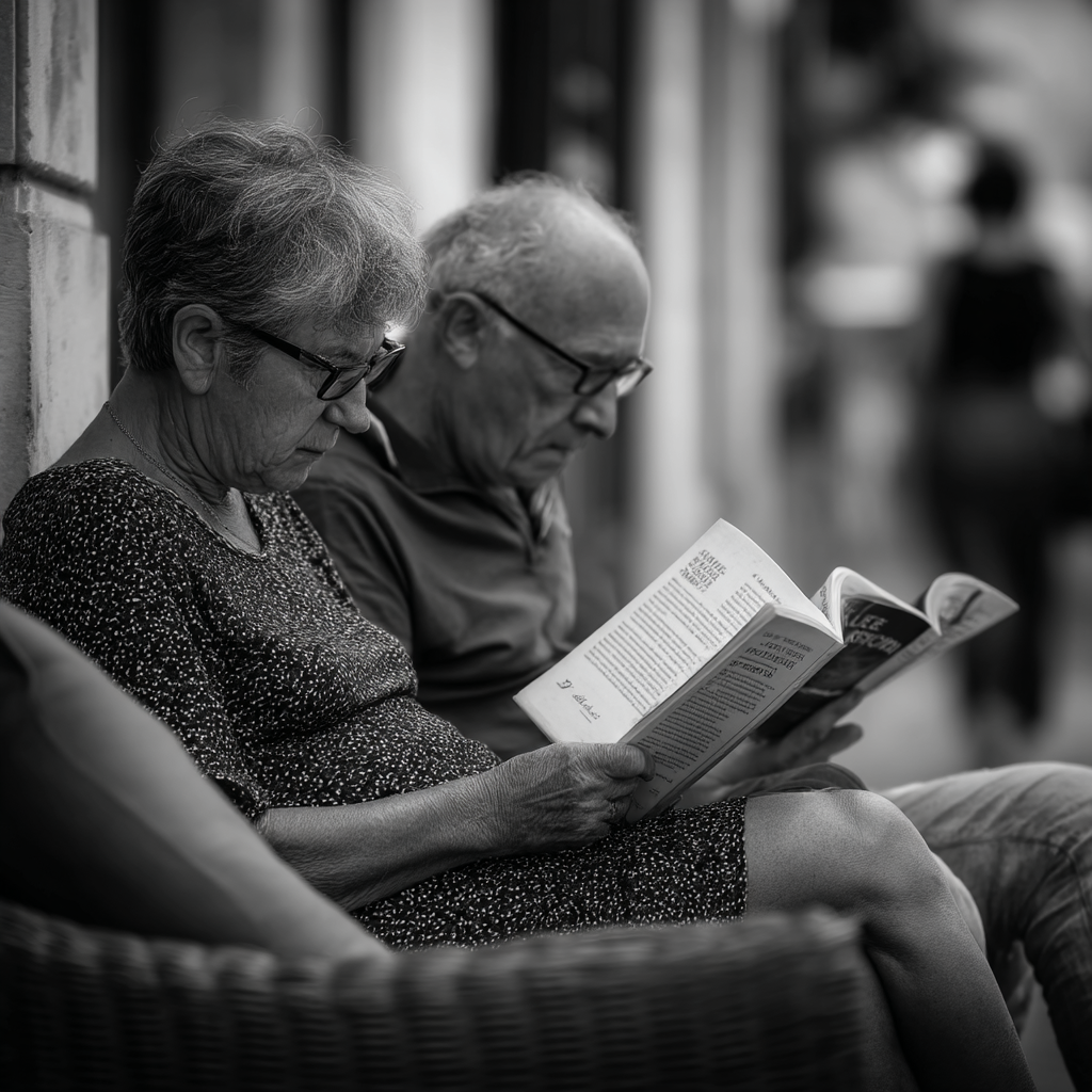 La imagen en blanco y negro muestra a una pareja de personas mayores sentadas en un banco, profundamente concentradas en la lectura de sus respectivos libros. La mujer, a la izquierda, viste un vestido de puntos y tiene el cabello corto y canoso. Sostiene el libro con una mano, mientras que la otra descansa sobre su muslo. Su expresión refleja tranquilidad y curiosidad. A su lado, el hombre usa gafas y está vestido con una camiseta, también absorto en su lectura. La escena transmite una sensación de intimidad y calma, con un enfoque en la actividad compartida de la lectura. De fondo, se pueden ver figuras vagamente blurred, sugiriendo un entorno urbano. La luz y las sombras añaden profundidad a la composición, destacando la conexión entre ambos.