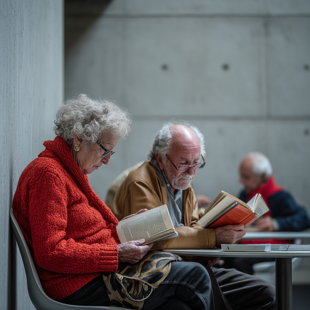 En la imagen se observa a dos personas mayores sentadas en una sala con paredes de concreto. A la izquierda, una mujer con cabello rizado y canoso lleva un suéter rojo y parece concentrada leyendo un libro; su postura sugiere una profunda inmersión en la lectura. A la derecha, un hombre de cabello canoso, también en estado de concentración, sostiene un libro que está leyendo. Ambos se encuentran en un ambiente minimalista, con mobiliario sencillo que resalta la tranquilidad del momento. En el fondo, se pueden ver otras personas sentadas, también leyendo, lo que añade a la atmósfera de un espacio dedicado a la lectura y la reflexión. La luz natural entra suavemente, iluminando el espacio y creando un ambiente acogedor.