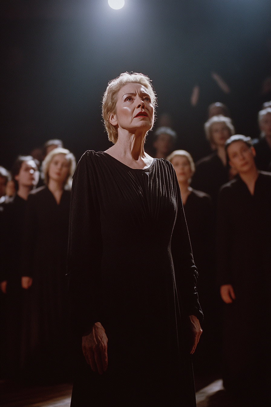 La imagen presenta a una mujer de cabello corto y canoso, destacándose en el centro del escenario iluminado. Viste un vestido negro que resalta su figura sobria y elegante. Su expresión facial es intensa y emotiva, con los ojos alzados hacia la luz que proviene de arriba, dándole un aire de contemplación o desafío. Detrás de ella, se pueden ver otras figuras en sombras, también vestidas de negro, que parecen ser parte de un coro o grupo, enfatizando su lugar como protagonista. La iluminación tenue y el contraste entre luces y sombras crean una atmósfera dramática y cargada de emoción. La disposición de los miembros del grupo en el fondo añade profundidad a la imagen, haciendo que el espectador se centre en la figura principal y su expresión de pasión.