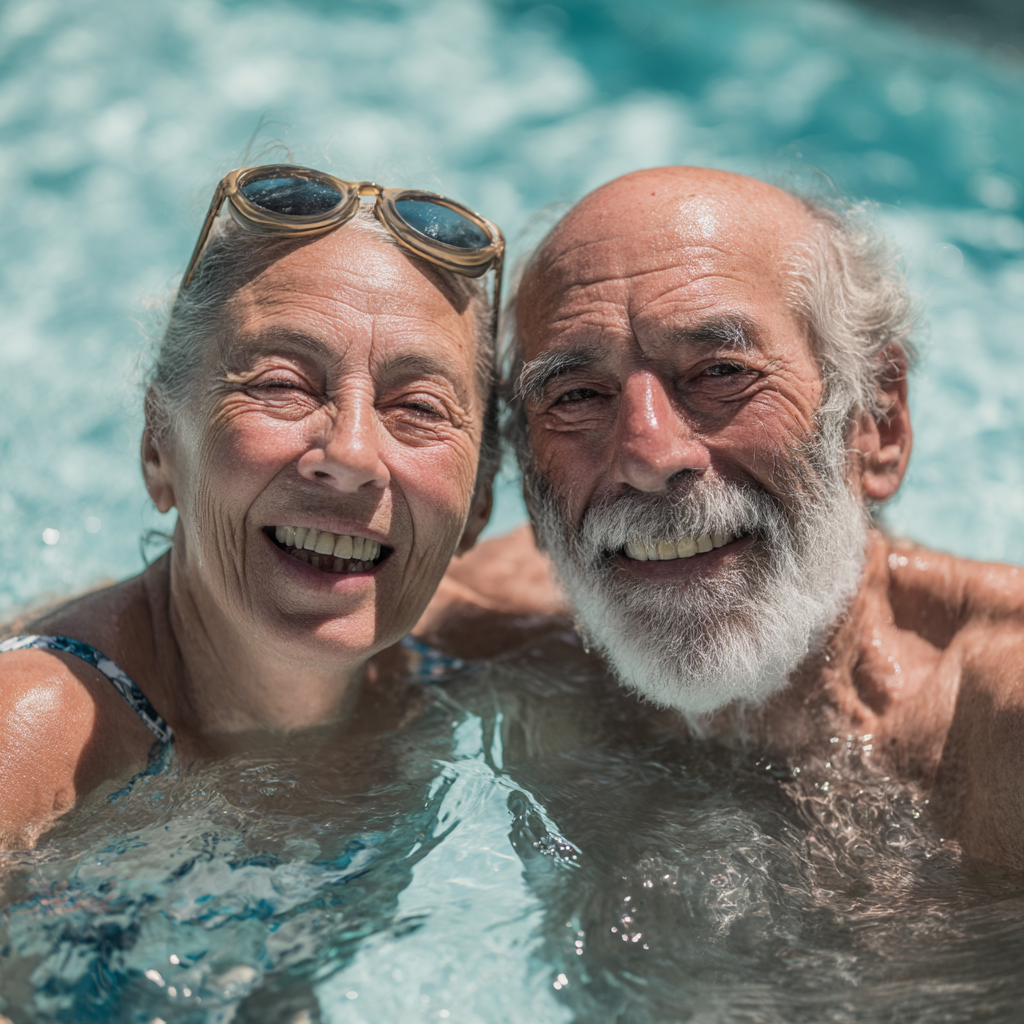 La imagen muestra a una pareja de adultos mayores disfrutando en una piscina. Ambos están sonriendo ampliamente, transmitiendo alegría y complicidad. La mujer tiene el cabello canoso, peinando una coleta, y lleva un traje de baño de tirantes con un diseño que parece floral. Ella también tiene gafas de sol colocadas en la cabeza, lo que sugiere un día soleado. El hombre, con una barba blanca y cabello del mismo color, muestra una expresión facial llena de felicidad. Ambos están empapados en agua, con el fondo difuso de la piscina reflejando un azul claro y brillante. El ambiente transmite una sensación de diversión y relajación, ideal para un día de verano. La iluminación es natural, resaltando las texturas del agua y la piel de los personajes.
