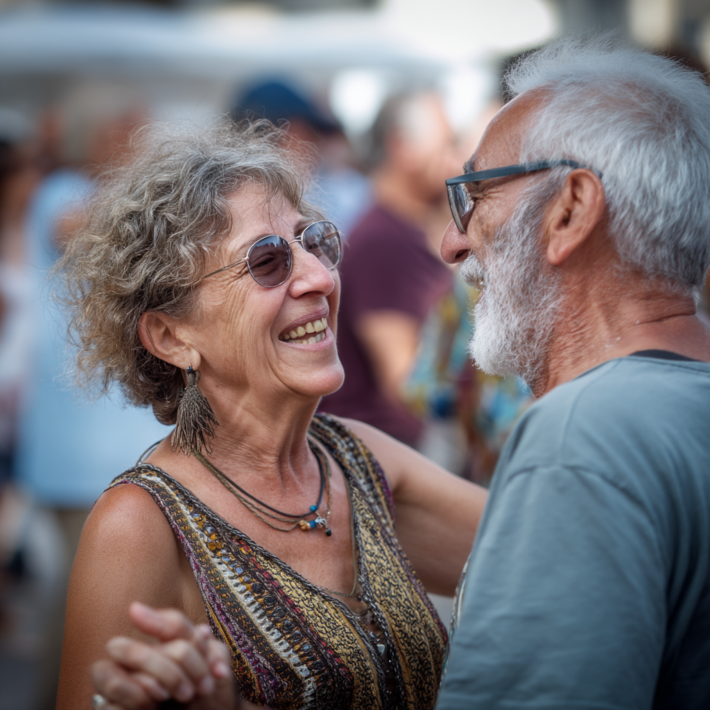 En la imagen se observa a una mujer y un hombre disfrutando de un momento alegre y cercano. La mujer tiene el cabello rizado y alborotado, lleva unas gafas de sol y aretes llamativos. Su vestido tiene un diseño colorido y vibrante, lo que refleja un estilo bohemio. Ella sonríe con entusiasmo mientras mira al hombre. Este tiene el cabello y la barba canosos, usando gafas que le dan un aspecto distinguido. Ambos parecen estar bailando o compartiendo una conversación cercana, ya que están muy cerca el uno del otro, lo que sugiere intimidad y felicidad. Al fondo, se puede ver un ambiente festivo con varias personas y una tienda, creando un contexto alegre y comunitario.