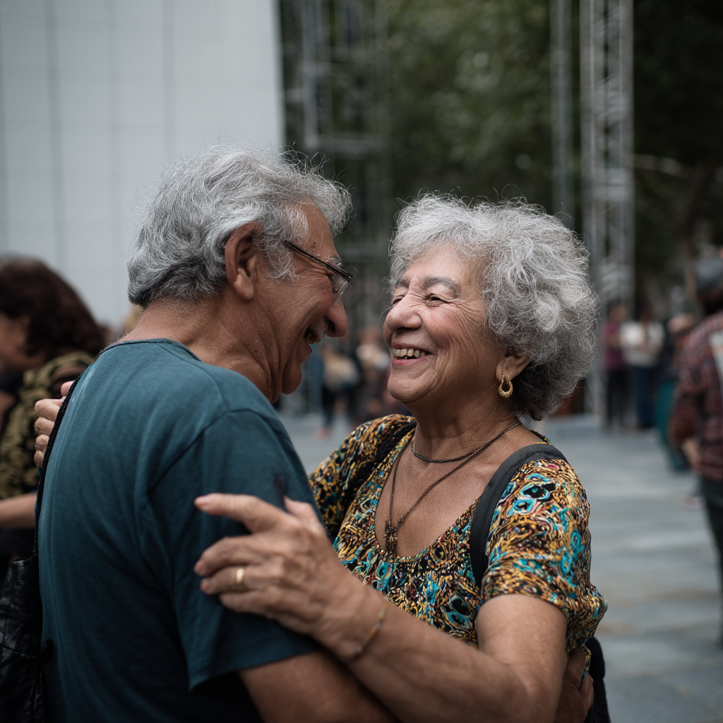 En la imagen se observa a una pareja de ancianos sonriendo y abrazándose con alegría. Ambos tienen cabello canoso y rizado, lo que les da un aire de ternura y complicidad. La mujer, a la derecha, lleva una blusa colorida con un patrón vibrante, mientras que el hombre, a la izquierda, viste una camiseta azul. Se encuentran en un entorno urbano, con un fondo difuso que sugiere la presencia de otras personas y edificios, aunque no están claramente definidos. La expresión facial de ambos transmite felicidad y conexión emocional; sus ojos brillan mientras se miran directamente. Este momento captura la esencia del amor y la compañía en la madurez, evocando sentimientos de nostalgia y alegría compartida.