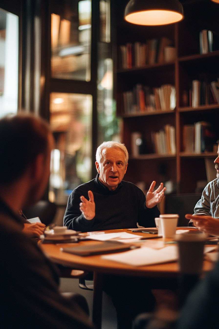 La imagen muestra a un grupo de personas en una reunión en un entorno acogedor y moderno, posiblemente una cafetería o un espacio de trabajo compartido. En el centro de la escena, un hombre mayor lleva una camiseta negra y está gesticulando con las manos, indicando que está compartiendo sus ideas o reflexiones con entusiasmo. A su alrededor, hay al menos tres personas más, cuyas expresiones y posturas sugieren que están atentas a lo que dice. La mesa está desordenada con papeles, tazas de café y algunos objetos personales, creando una atmósfera de colaboración y diálogo. Las ventanas grandes permiten la entrada de luz natural, resaltando la calidez del espacio, y una estantería con libros se puede ver en el fondo.
