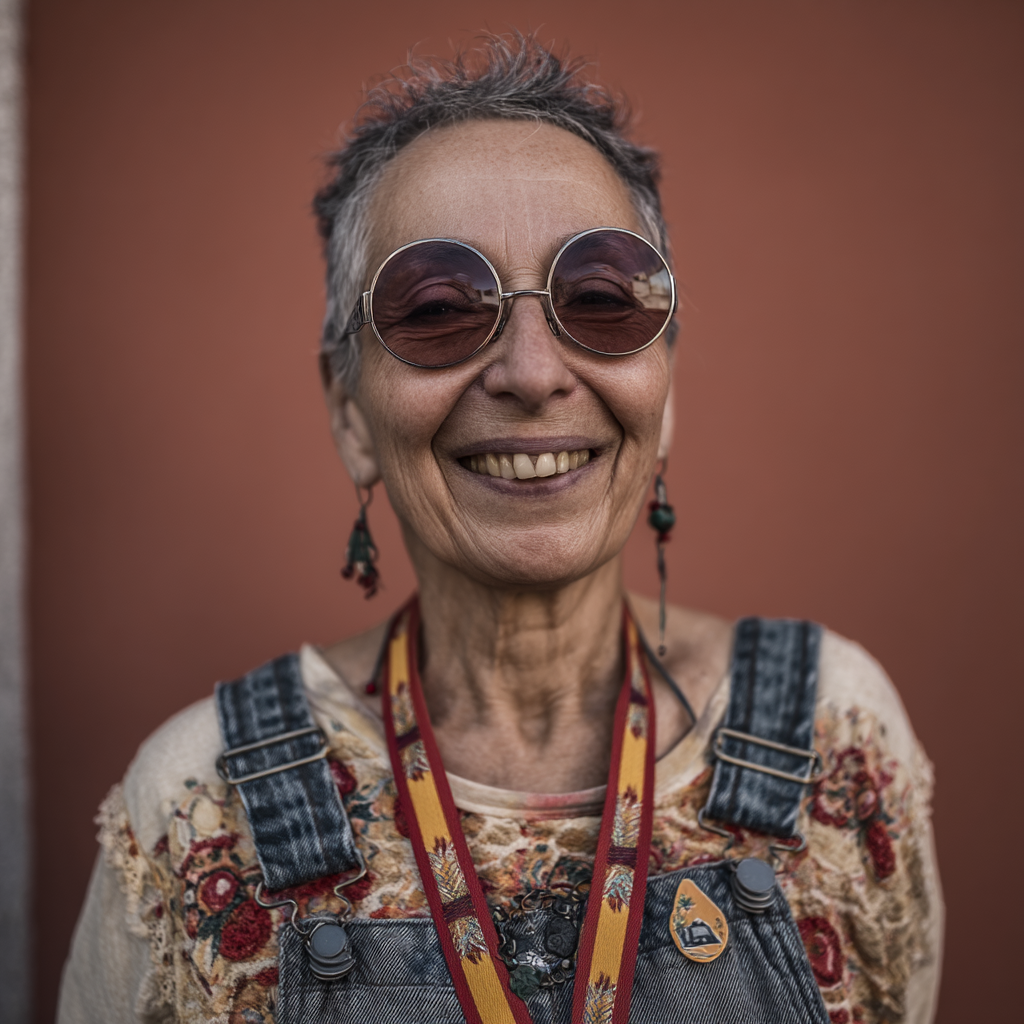 La imagen presenta a una mujer mayor sonriendo, con una expresión de calidez y alegría. Su piel es de tono claro y tiene el cabello corto y gris. Lleva unas gafas de sol grandes, con montura plateada en tonos oscuros. Su atuendo incluye un overol de mezclilla con una blusa que tiene bordados coloridos en la parte superior. En su cuello, lleva un collar y en el pecho se puede apreciar una medalla o insignia de forma ovalada que parece tener un diseño distintivo. Las arrugas en su rostro transmiten una vida llena de experiencias, y su mirada es amigable. El fondo es de un color naranja suave, lo que resalta su presencia en la imagen.