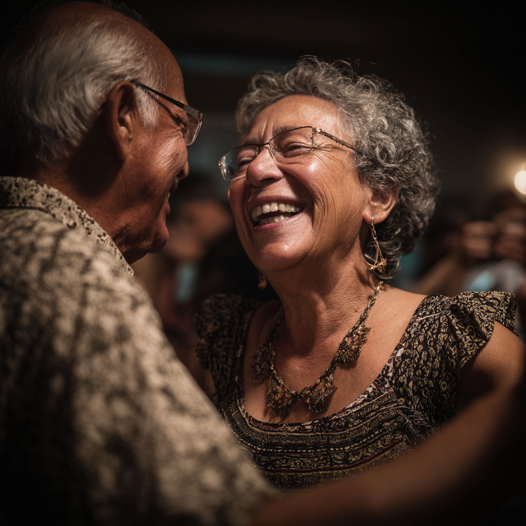 La imagen captura un momento tierno y lleno de alegría entre una pareja de ancianos bailando y sonriendo el uno al otro en un ambiente cálido y festivo. La mujer, con cabello rizado y canoso, lleva una blusa con un diseño vibrante y un collar elaborado que complementa su estilo. Su expresión refleja felicidad y complicidad. El hombre, con cabello canoso y usando gafas, también muestra una sonrisa sincera mientras interactúa con ella, lo que sugiere un vínculo profundo y amoroso. El fondo resalta una atmósfera de celebración, con luces suaves que lanzan un brillo cálido, y la presencia tenue de otras personas disfrutando del evento, lo que contribuye a la sensación de alegría compartida.