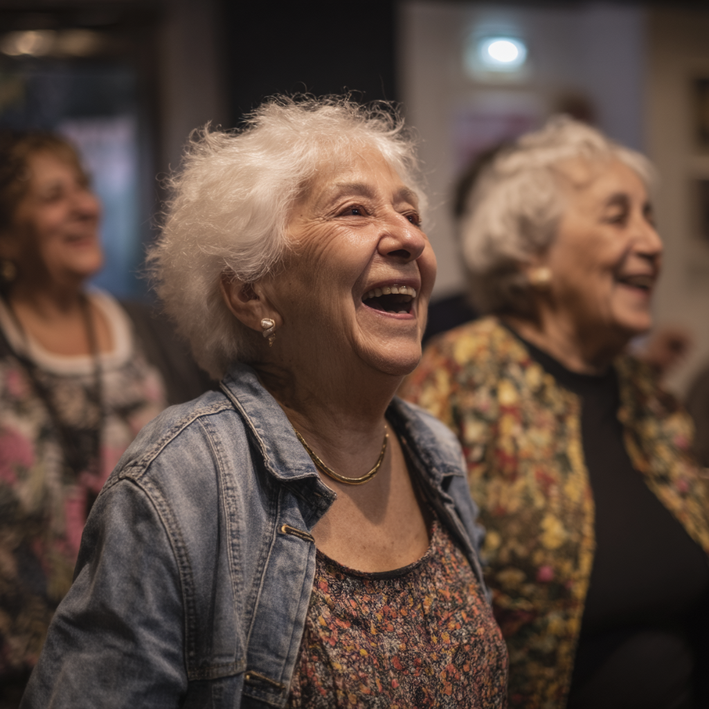 La imagen muestra un grupo de mujeres mayores en un ambiente alegre y festivo. En primer plano, una mujer de cabello canoso y rizado, visiblemente emocionada, se ríe ampliamente, revelando una expresión de felicidad genuina. Viste una camiseta floral bajo una chaqueta de mezclilla, y luce joyas discretas que complementan su atuendo. Al fondo, se pueden ver otras mujeres que también parecen disfrutar del momento, sonriendo y compartiendo la alegría del instante. La iluminación suave del lugar crea una atmósfera cálida y acogedora, y las paredes tienen decoraciones sutiles que sugieren un evento social. Este retrato captura no solo la risa, sino también un sentido de comunidad y disfrute entre generaciones.