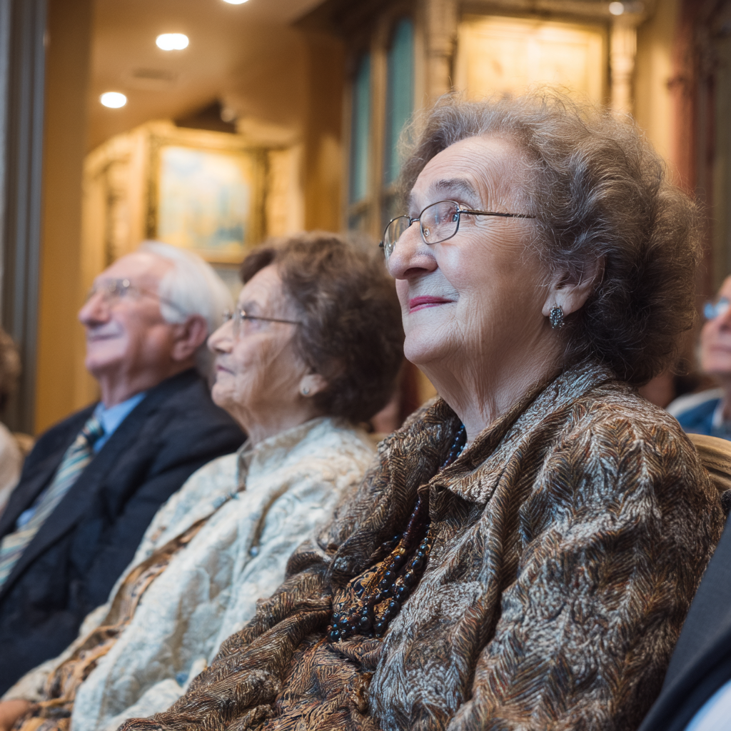La imagen presenta un grupo de personas de edad avanzada sentadas y observando con atención. En el primer plano, se destaca una mujer de cabello rizado y gris, que lleva gafas y una blusa marrón con un diseño texturizado. Ella parece concentrada y ligeramente sonriente, lo que sugiere interés y satisfacción. A su lado, hay otra mujer con cabello castaño claro que también viste una prenda suave. En el fondo, se pueden ver dos hombres; uno de ellos tiene el cabello blanco y lleva un traje oscuro, mientras que el otro está en perfil. La escena se desarrolla en un entorno acogedor, con elementos decorativos que sugieren un evento cultural o social, y se nota una iluminación cálida, lo que añade un aire de serenidad a la situación.