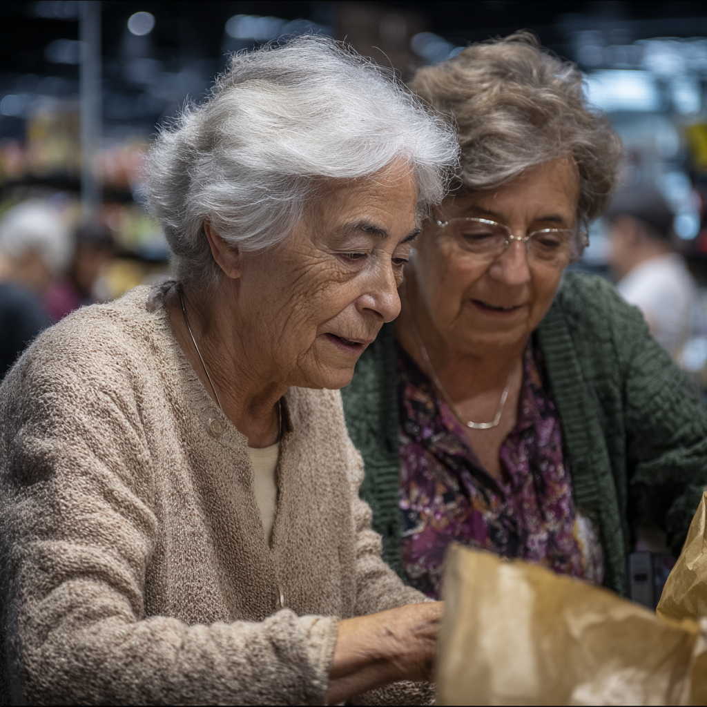 La imagen muestra a dos mujeres mayores en un ambiente al aire libre que parece ser un mercado. Ambas mujeres tienen cabello canoso y están vestidas con suéteres de diferentes colores. Están inclinándose hacia una mesa, pareciendo concentradas en lo que tienen enfrente, posiblemente revisando productos o algún tipo de compras. Se nota que hay un aire de complicidad y cercanía en su interacción, lo que sugiere una relación de amistad o familiaridad. En el fondo se pueden ver otras personas y estanterías, lo que añade un contexto dinámico a la escena. La iluminación es suave, destacando las expresiones atentas de las mujeres.