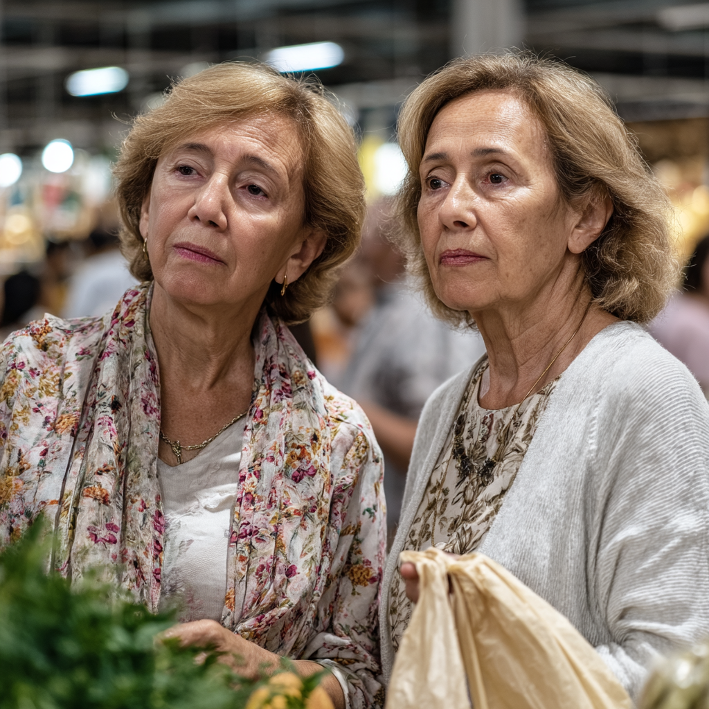 La imagen muestra a dos mujeres de edad media en un mercado, observando detenidamente algo que les ha llamado la atención. Ambas tienen el cabello rubio y llevan ropa de tonos suaves; una de ellas viste una blusa clara con una bufanda de flores, mientras que la otra lleva un suéter beige sobre una blusa con estampado. Las expresiones en sus rostros reflejan curiosidad y concentración. En primer plano, se puede ver una mano que sostiene una bolsa de papel, mientras que en el fondo se aprecian otros compradores y un ambiente vibrante típico de un mercado. La luz es suave y cálida, creando una atmósfera acogedora y amigable.