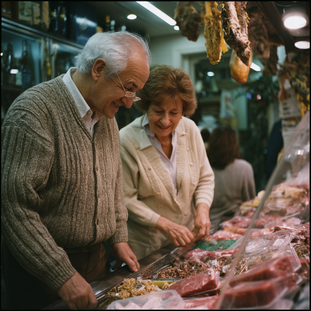 En la imagen se observa a una pareja de ancianos en un mercado de alimentos, típicamente español. Ambos están de pie frente a un mostrador repleto de diversos tipos de carne y embutidos. El hombre, con cabello canoso y un suéter de lana, inclina la cabeza mientras sonríe, mostrando una expresión de interés hacia lo que están viendo. La mujer, que lleva un suéter claro, también sonríe mientras examina detenidamente los productos. La atmosfera es cálida y acogedora, con una iluminación suave que resalta la frescura de los productos. En el fondo, se pueden ver estantes con botellas y otros alimentos, lo que sugiere que el lugar es un mercado tradicional. La interacción entre ambos sugiere un momento de complicidad y disfrute compartido en la selección de alimentos.