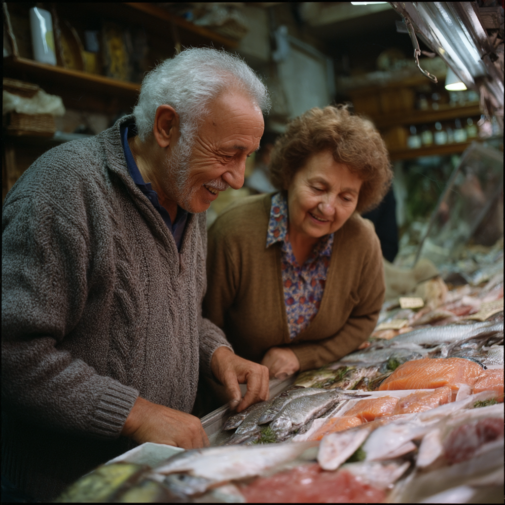 La imagen muestra a un hombre y una mujer mayores en un mercado de pescado. Ambos se inclinan hacia una mesa repleta de diferentes tipos de pescado fresco, que incluye salmones, doradas y otros mariscos. El hombre, con cabello canoso y una barba pequeña, lleva un suéter de lana gris y parece sonreír mientras examina el pescado. La mujer, también sonriente, tiene el cabello rizado y lleva un suéter marrón sobre una camisa de estampado floral. El ambiente es cálido y acogedor, con estantes repletos de productos en el fondo, sugiriendo un mercado local animado. La interacción entre ellos refleja una conexión personal y un sentido de comunidad mientras disfrutan de la experiencia de compra.