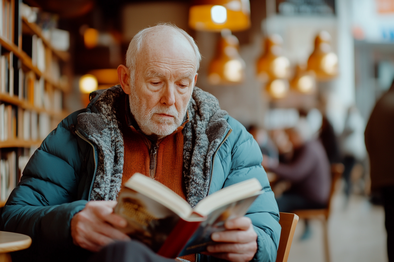La imagen muestra a un hombre mayor sentado en un ambiente acogedor, posiblemente una cafetería o una biblioteca informal. El hombre, con un cabello y barba canosos, luce concentrado mientras lee un libro que sostiene con manos arrugadas. Viste una chaqueta azul con un forro de pelaje, que indica que busca comodidad en un lugar cálido. El fondo presenta estanterías con libros y mesas donde otras personas parecen disfrutar de sus propios momentos. La luz es suave y cálida, generando una atmósfera tranquila y propicia para la lectura. Los detalles del ambientado hacen resaltar la curiosidad y el amor por los libros, evocando una sensación de paz.