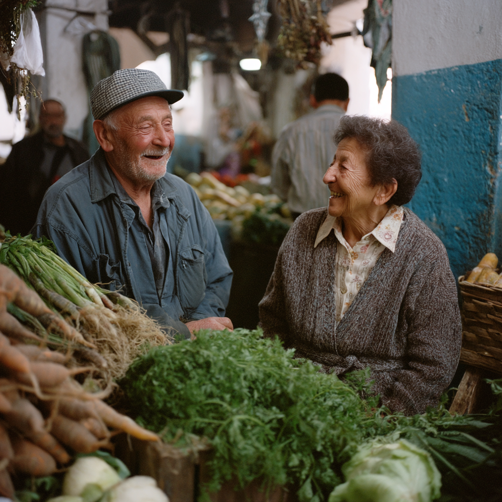 La imagen presenta un ambiente vibrante de un mercado, donde se puede ver a un hombre y una mujer sentados frente a una colorida exhibición de verduras frescas. Ambos lucen sonrientes y comparten un momento de alegría. El hombre, con una gorra de cuadros y vestido con una camisa y chaqueta, parece disfrutar de la conversación. A su lado, la mujer lleva un suéter gris y una blusa blanca con un patrón sutil, mostrando una expresión cálida y amigable. Detrás de ellos, se observa un fondo de puestos repletos de verduras como zanahorias y hierbas frescas. La iluminación suave crea una atmósfera acogedora, sugiriendo una conexión personal y comunitaria entre los vendedores y compradores del mercado.