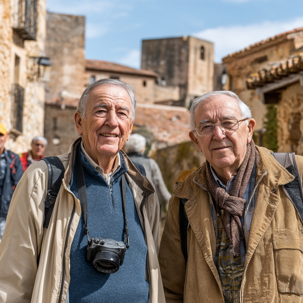La imagen muestra a dos hombres mayores que sonríen y posan juntos en un entorno urbano. Ambos llevan puesta ropa informal: uno viste un abrigo beige y un suéter azul, con una cámara colgada del cuello; el otro lleva un abrigo marrón claro y una bufanda. Al fondo, se pueden ver edificios de piedra con techos de tejas envejecidas, lo que sugiere un ambiente histórico o pintoresco. La luz del día es suave, lo que proporciona una atmósfera cálida y agradable. Otros visitantes pueden ser vistos en el fondo, contribuyendo al ambiente de exploración y disfrute. La imagen evoca sentimientos de amistad, aventura y la apreciación por la belleza del entorno.