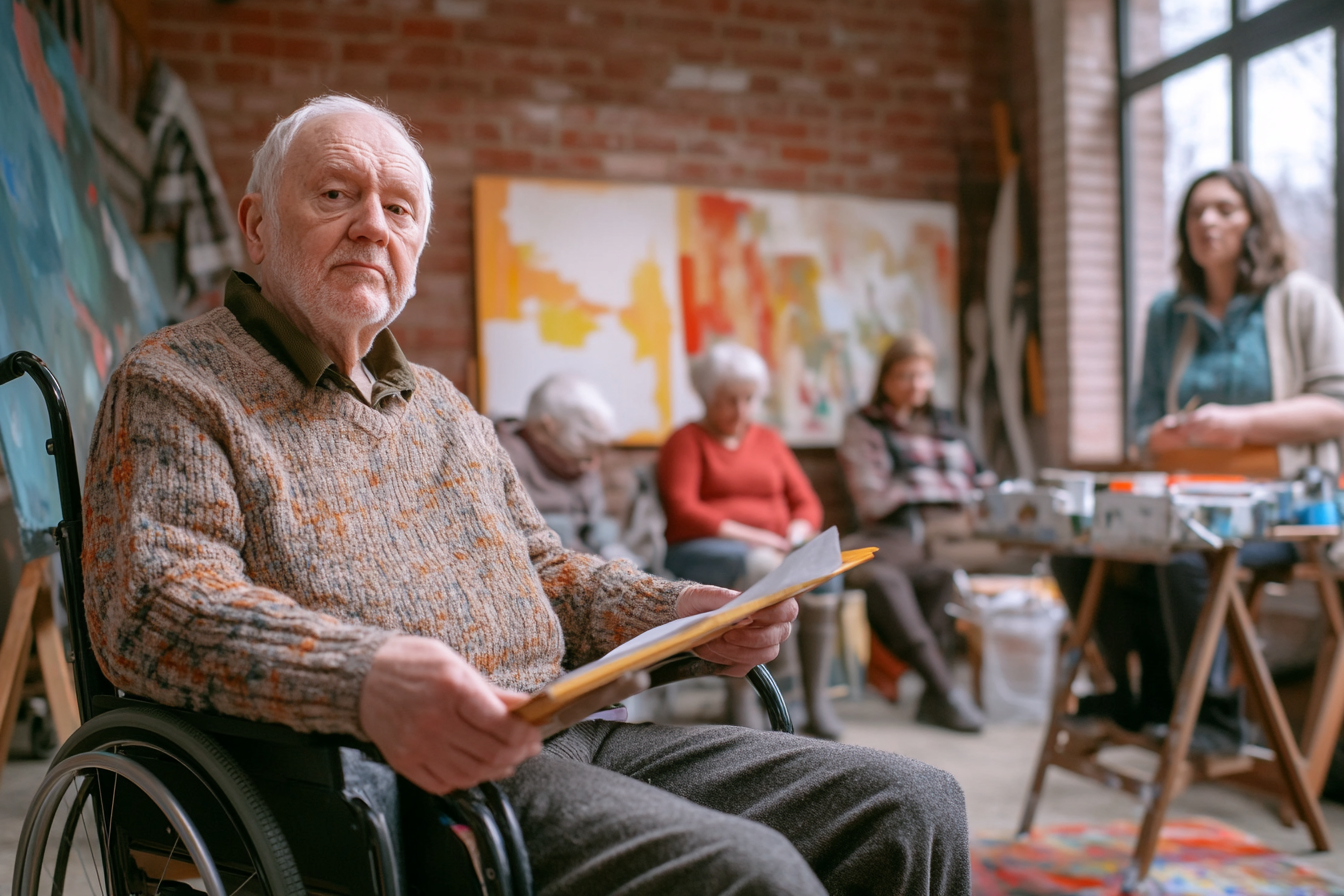 La imagen muestra a un hombre mayor sentado en una silla de ruedas, sosteniendo un cuaderno o una hoja de papel. Está vestido con un suéter de colores cálidos y tiene el cabello canoso. Su expresión es seria pero contemplativa. Al fondo, hay un grupo de mujeres, algunas de las cuales están enfocadas en una actividad creativa, probablemente pintura, dado el entorno artístico. La sala tiene paredes de ladrillo expuesto y grandes ventanales, lo que permite que entre luz natural. Detalles como las obras de arte coloridas en las paredes y los materiales de arte en las mesas resaltan la atmósfera creativa y comunitaria del espacio.