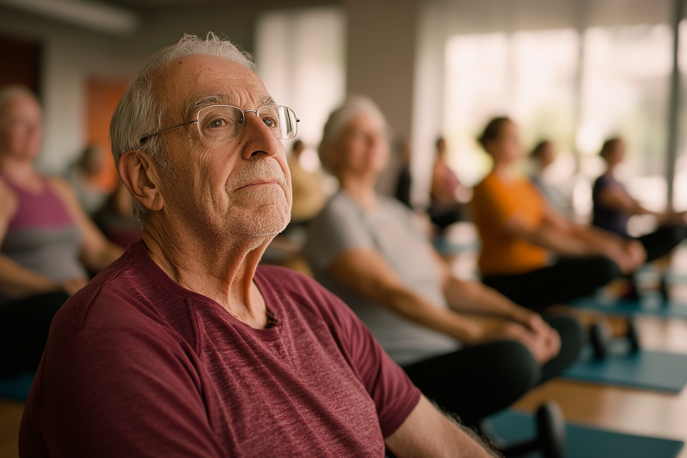 La imagen muestra a un grupo de personas de diversas edades participando en una clase de ejercicios, probablemente yoga o meditación, en un ambiente iluminado y acogedor. En primer plano, se observa a un hombre mayor con gafas y una expresión serena en su rostro, lo que sugiere concentración. Lleva una camiseta de color burdeos que complementa su cabello canoso. Al fondo, se pueden ver a otros participantes que, aunque desenfocados, parecen estar en posturas de meditación, sentados sobre esterillas. La luz natural entra por las ventanas, creando un ambiente calmo y propicio para la práctica de ejercicios de relajación. La escena transmite una sensación de comunidad y bienestar.