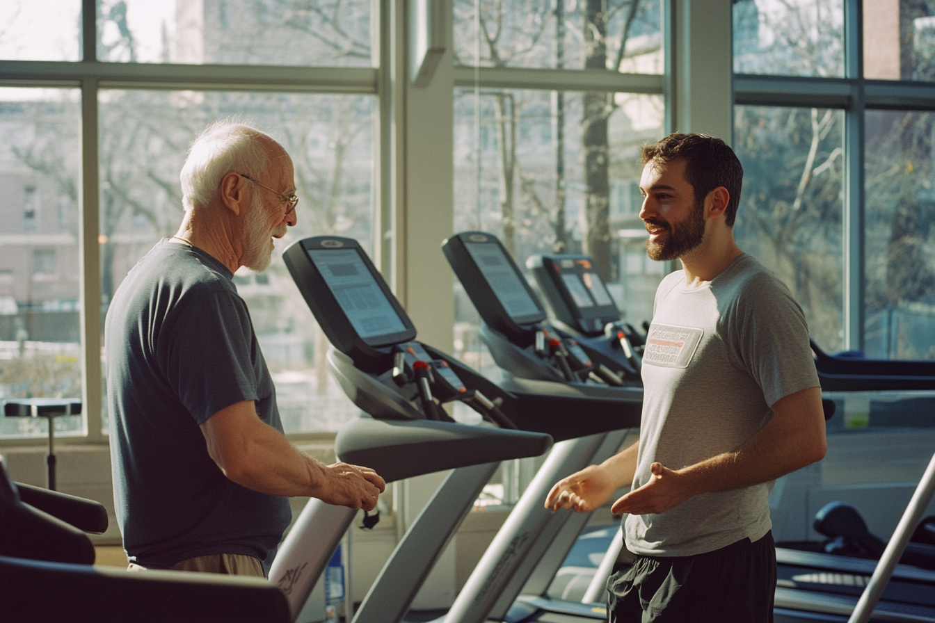 La imagen muestra a dos hombres conversando en un gimnasio, rodeados de máquinas de ejercicio. A la izquierda, un hombre mayor con cabello canoso y barba blanca lleva una camiseta oscura. A su derecha, un hombre más joven, con barba y cabello oscuro, viste una camiseta gris y parece sonreír mientras habla. La luz natural entra a raudales por las ventanas, iluminando la escena y creando un ambiente cálido y acogedor. Las máquinas de cardio, como cintas de correr y elípticas, están visibles en el fondo, lo que sugiere que ambos hombres están en un entorno dedicado al acondicionamiento físico. La expresión de ambos refleja una interacción amistosa, destacando la conexión generacional entre ellos.