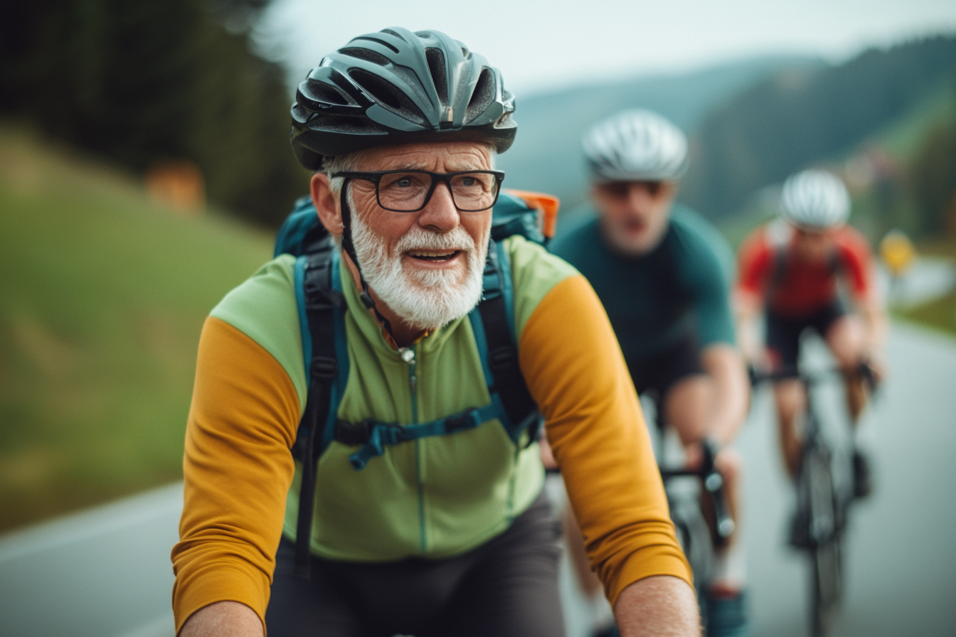 En la imagen se observa a un grupo de ciclistas pedaleando por una carretera rodeada de un paisaje montañoso. Al frente, se destaca a un ciclista de edad avanzada con pelo canoso y una barba bien cuidada. Lleva puesta una camiseta de color verde con mangas amarillas y un casco de ciclismo negro. Su expresión facial muestra determinación y alegría, reflejando el disfrute de la actividad. Detrás de él, se pueden ver otros ciclistas en segundo plano, llevando cascos y vestimenta deportiva, lo que sugiere un ambiente de camaradería y ejercicio al aire libre. La carretera es estrecha y parece estar rodeada de naturaleza, con árboles y colinas al fondo. La luz del día es suave, dando un toque cálido a la escena.