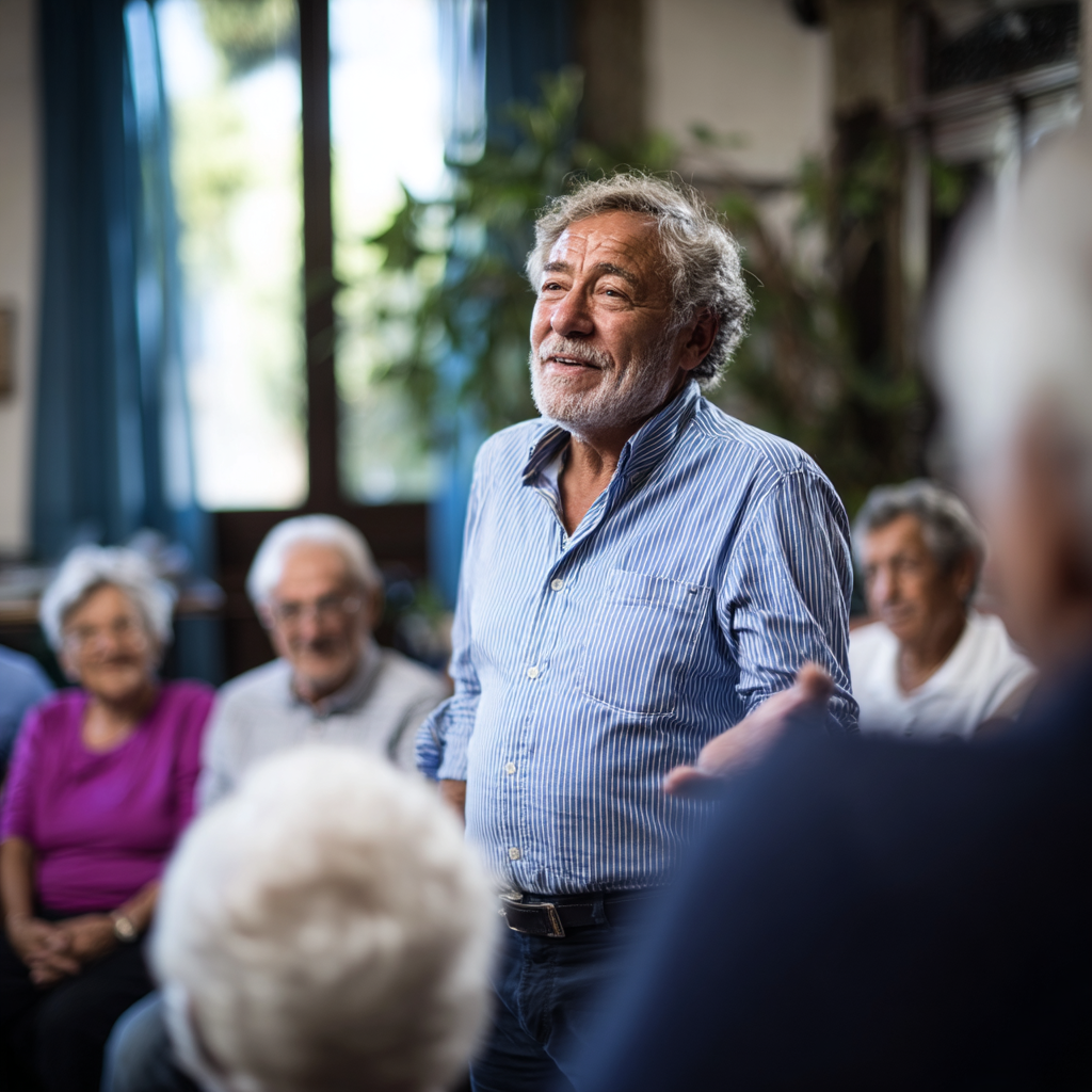 La imagen muestra a un hombre de edad media, con cabello canoso y barba, de pie y sonriendo mientras habla a un grupo de personas mayores que lo escuchan atentamente. El hombre viste una camisa de rayas azul y pantalones oscuros. Detrás de él, se pueden ver ventanas grandes que dejan pasar abundante luz natural, creando un ambiente acogedor. En el fondo, hay varias personas mayores sentadas, que parecen disfrutar de la conversación. Algunos de ellos están sonriendo o asintiendo, lo que sugiere que están involucrados en la interacción. La escena se desarrolla en un entorno bien iluminado, posiblemente en un centro de actividades o un hogar para ancianos, rodeado de plantas que aportan un toque de vida al espacio.