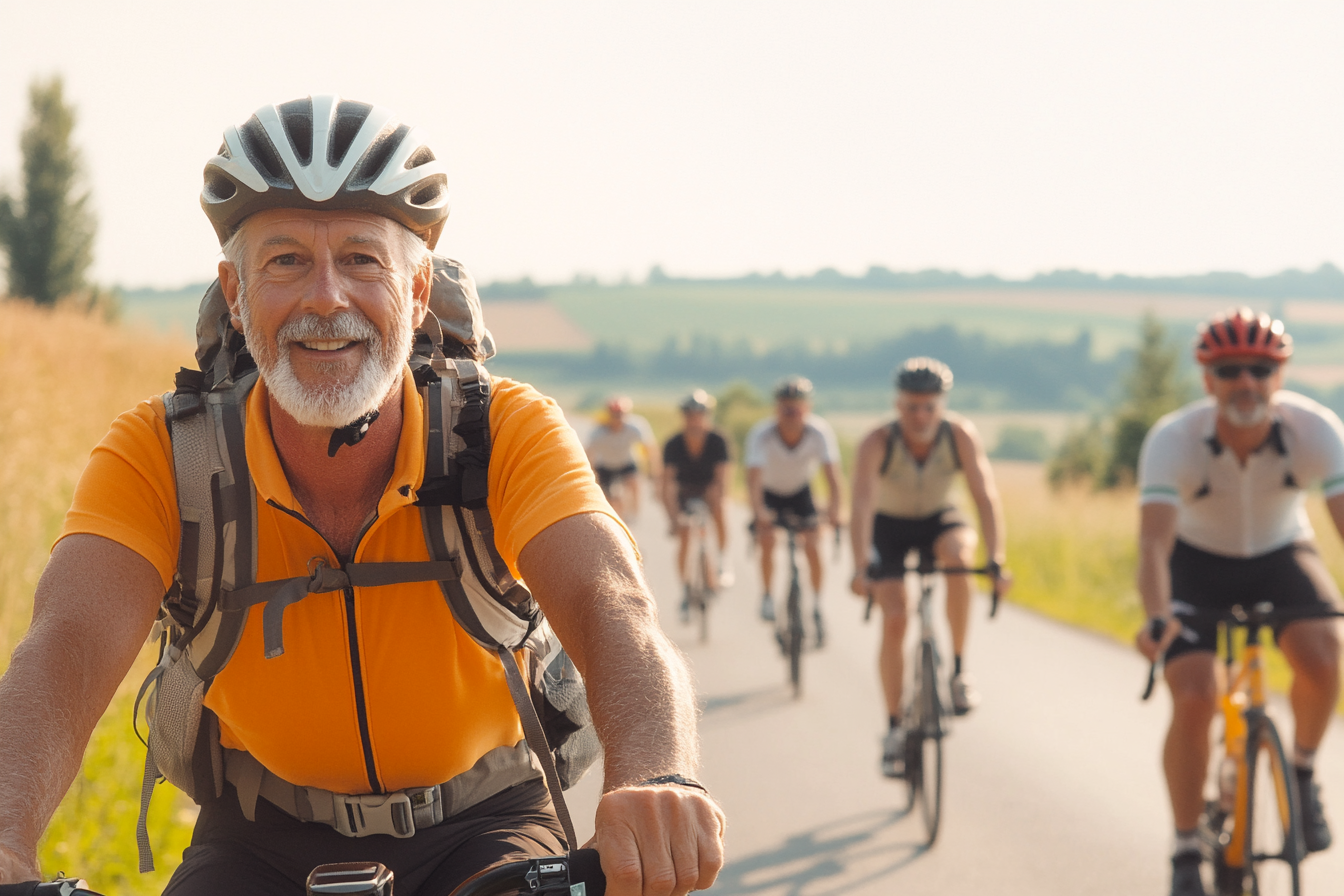 La imagen muestra a un grupo de ciclistas disfrutando de un día soleado en un paisaje rural. En primer plano, un ciclista mayor sonríe a la cámara, vistiendo una camiseta naranja y un casco blanco con franjas grises, además de un mochila ligera. Detrás de él, se pueden ver otros ciclistas en diferentes niveles de actividad, algunos de ellos ya en movimiento hacia el fondo del camino. El entorno presenta un paisaje verde, con campo y colinas suaves al fondo, lo que sugiere un ambiente tranquilo y natural. La iluminación es suave y cálida, indicando que podría ser por la mañana o la tarde. La expresión alegre del ciclista principal denota una actitud positiva hacia el ciclismo y el aire libre.
