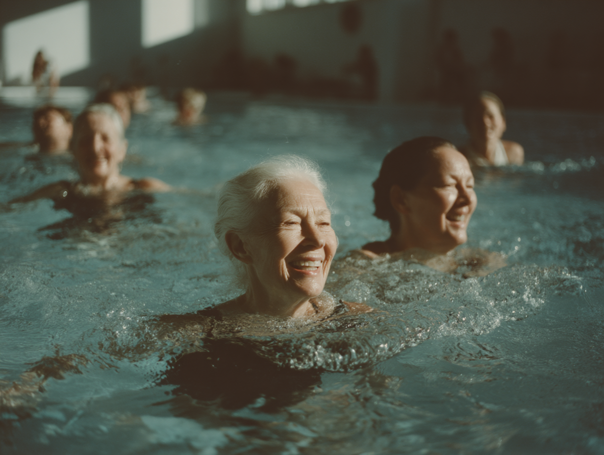 La imagen muestra a un grupo de mujeres mayores disfrutando de una sesión de ejercicio en el agua, probablemente en una piscina. La mujer en primer plano, de cabello blanco, sonríe con alegría, lo que refleja el ambiente positivo de la actividad. Las otras mujeres, que también parecen divertida, están parcialmente sumergidas en el agua, con expresiones de felicidad. La luz natural entra a través de grandes ventanales, iluminando la escena y creando un ambiente cálido. El agua tiene un color azul claro y hay pequeñas ondulaciones generadas por el movimiento de las participantes. La fotografía transmite una sensación de camaradería y bienestar, resaltando la alegría de mantenerse activo en la avanzada edad.